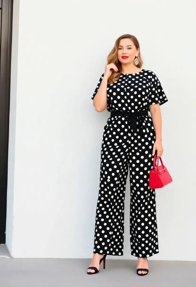 Flirty polka dot jumpsuit paired with chunky heels for a playful vibe