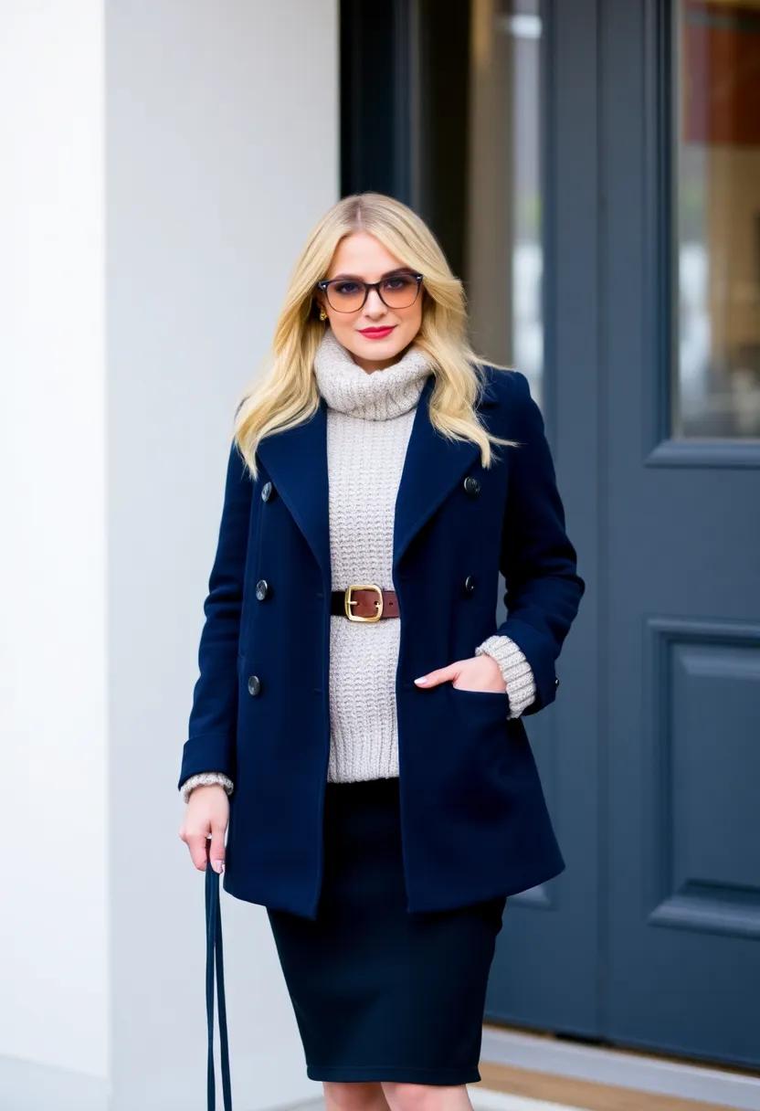 For a striking ensemble that melds classic elegance with contemporary flair, consider combining a navy peacoat with a beige turtleneck skirt.This pairing not only highlights the rich texture of both pieces but also plays beautifully with color contrasts. The deep navy hue of the peacoat exudes sophistication while the warmth of beige softens the look, making it perfect for both casual outings and more polished occasions.