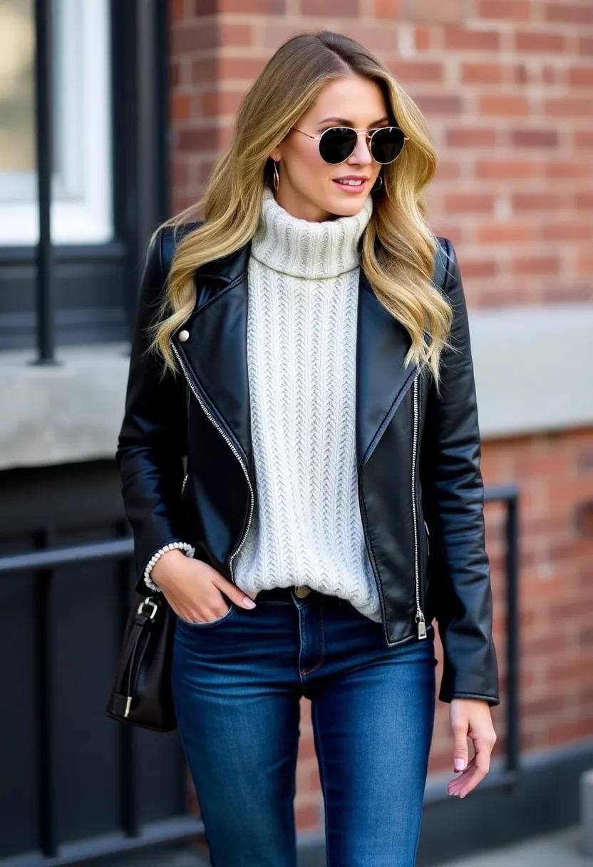 10) Go for Layering: Add a thin turtleneck beneath your knit sweater for added warmth and style, while your leather jacket effortlessly brings an air of cool to the mix