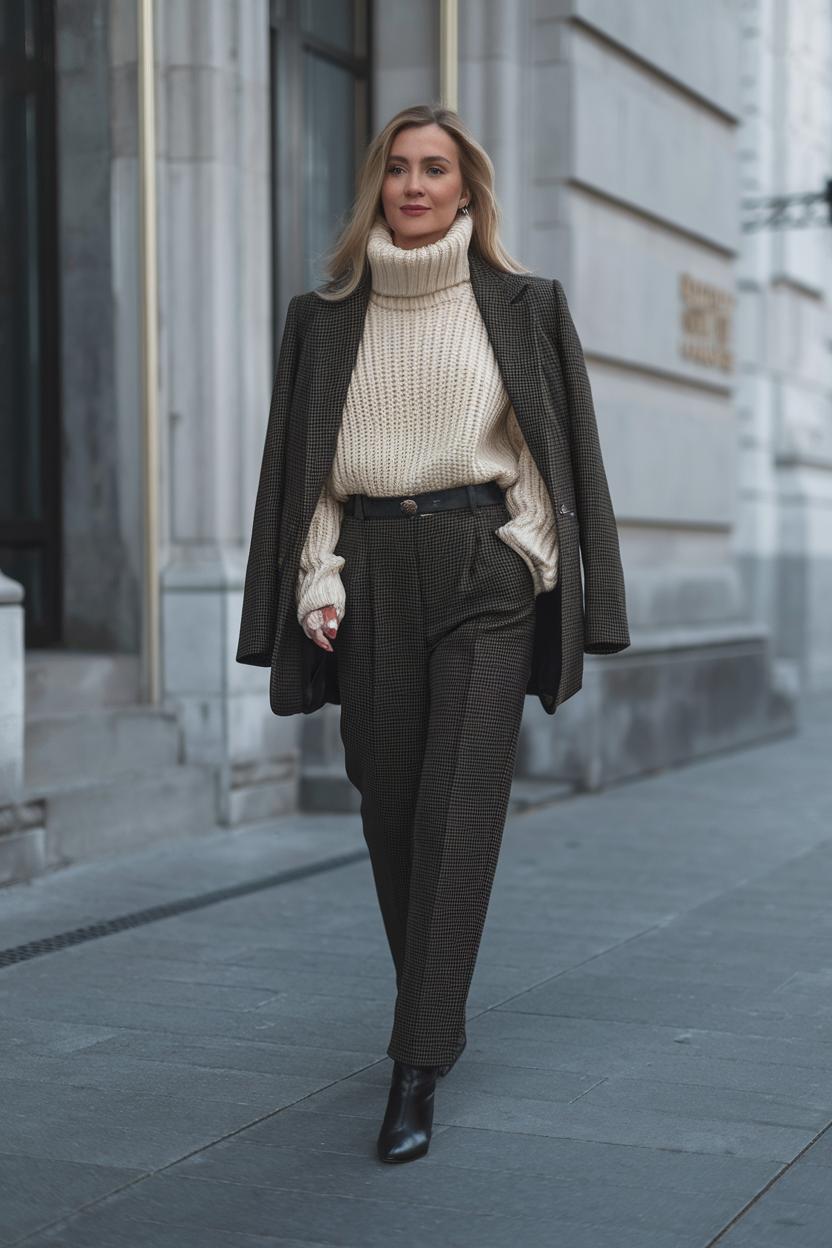 Layer a turtleneck chunky sweater under a blazer and high-waisted pants