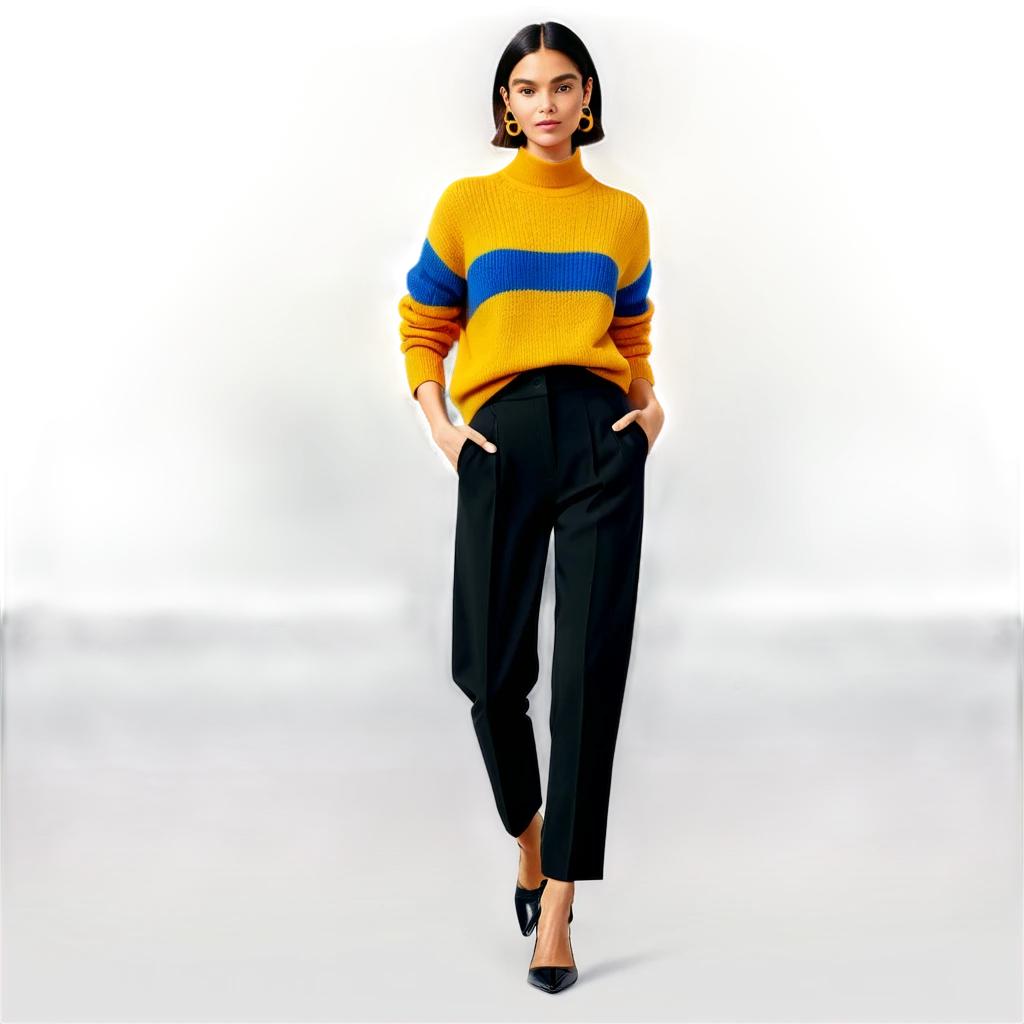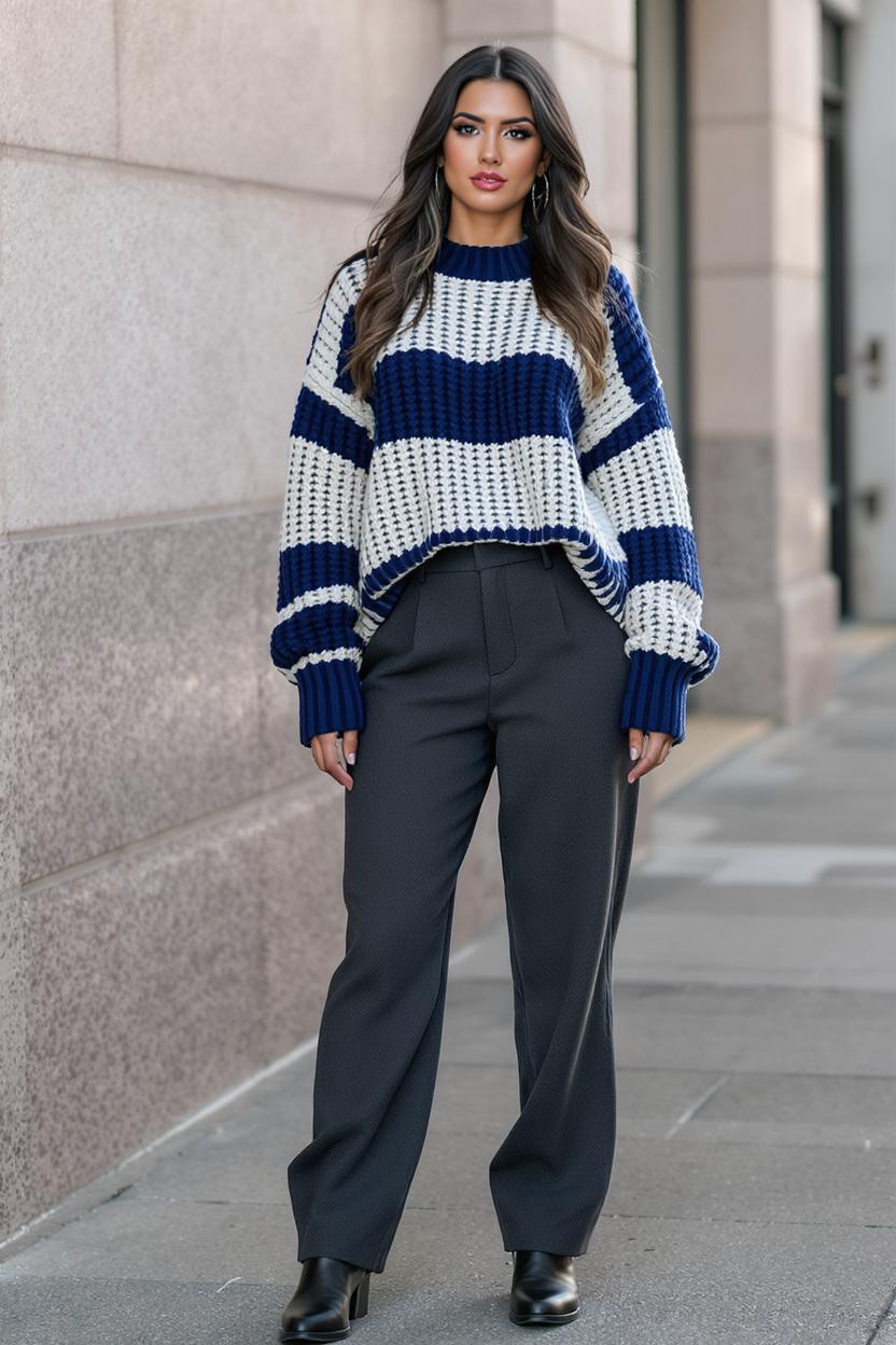 Pairing a striped chunky sweater with solid high-waisted pants creates an effortlessly balanced outfit that feels both cozy and polished. The stripes add visual interest and texture, while the clean lines of solid pants keep the look grounded and sophisticated. Opt for a sweater with bold, wide stripes in neutral or earthy tones to maintain that chic, seasonal vibe. The high waist of the pants not only elongates your silhouette but also offers a perfect canvas to tuck in or slightly crop your sweater for a flattering shape.