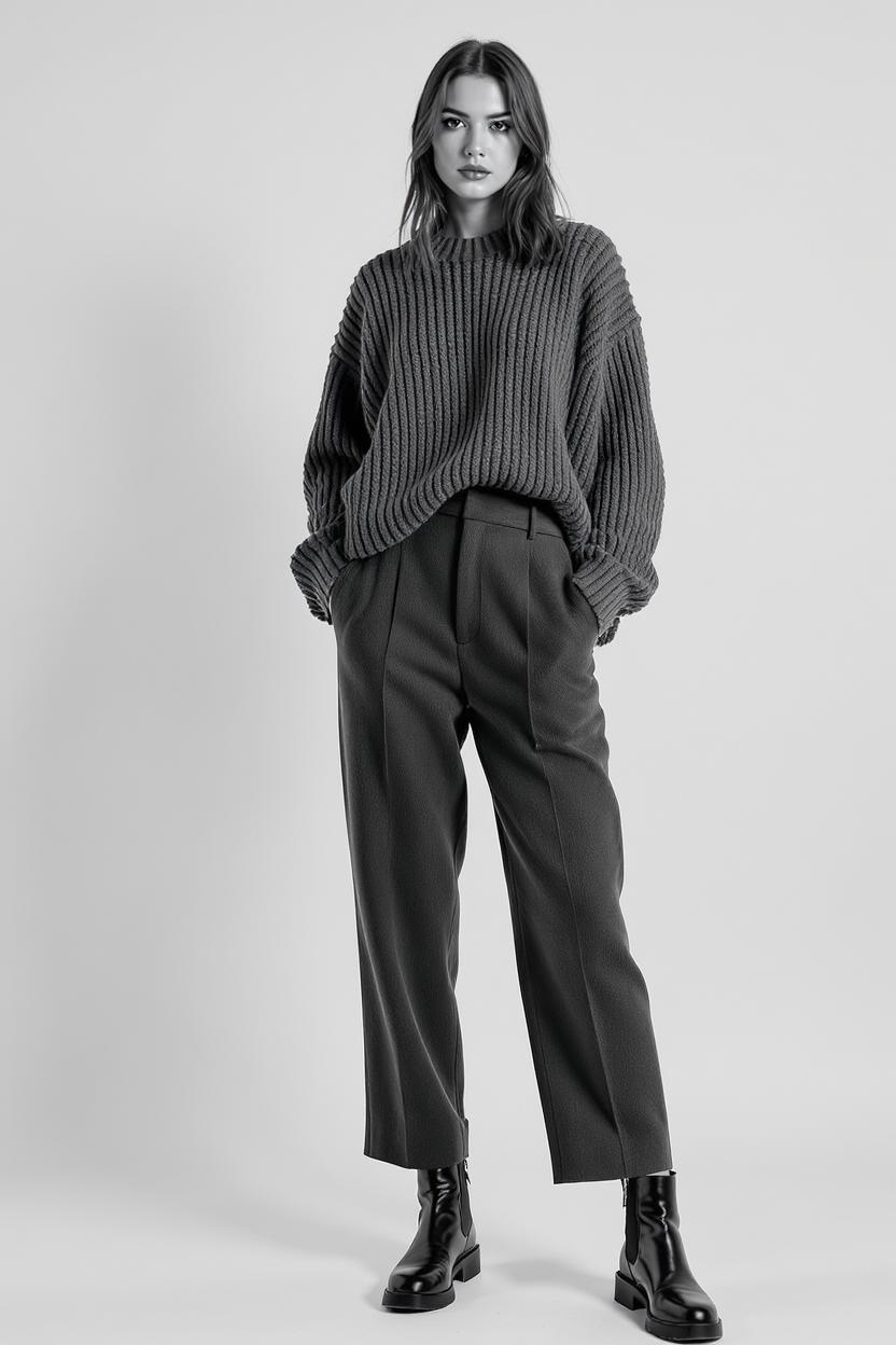 When choosing your footwear, think sleek boots with a modest heel to elevate the entire outfit without overwhelming it. Ankle boots in suede or leather add an extra layer of texture contrast, complementing the knit’s softness and the trousers’ tailored flair. To complete the look, accessorize with delicate gold jewelry and a structured crossbody bag, which keeps the overall profile polished and chic. This style effortlessly transitions from casual brunches to relaxed office days, making it a versatile go-to for chilly weather fashion.