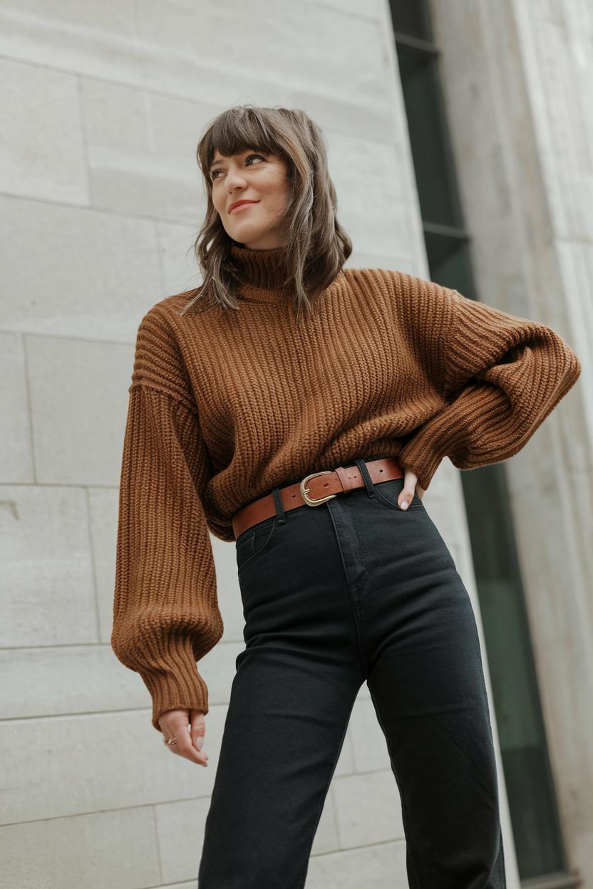 - Balance proportions by tucking in your chunky sweater or using a fitted silhouette up top.