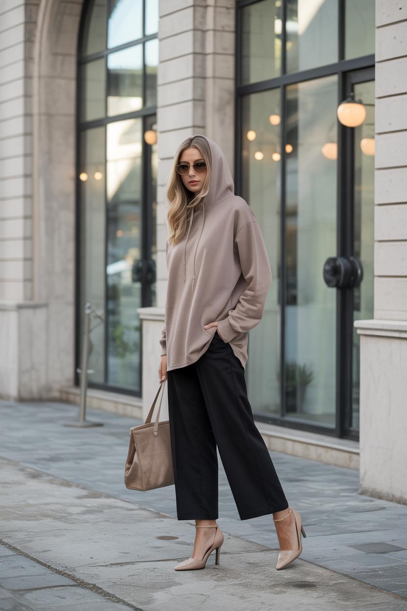 To polish the outfit and add a hint of sophistication, slip on a pair of classic pumps in a muted shade-think nude, black, or deep brown. Their timeless silhouette and sleek heel elevate the casual vibe of the hoodie while seamlessly complementing the pants’ boldness. For finishing touches, accessorize with delicate gold jewelry and a structured handbag to keep the look chic and effortlessly pulled together.