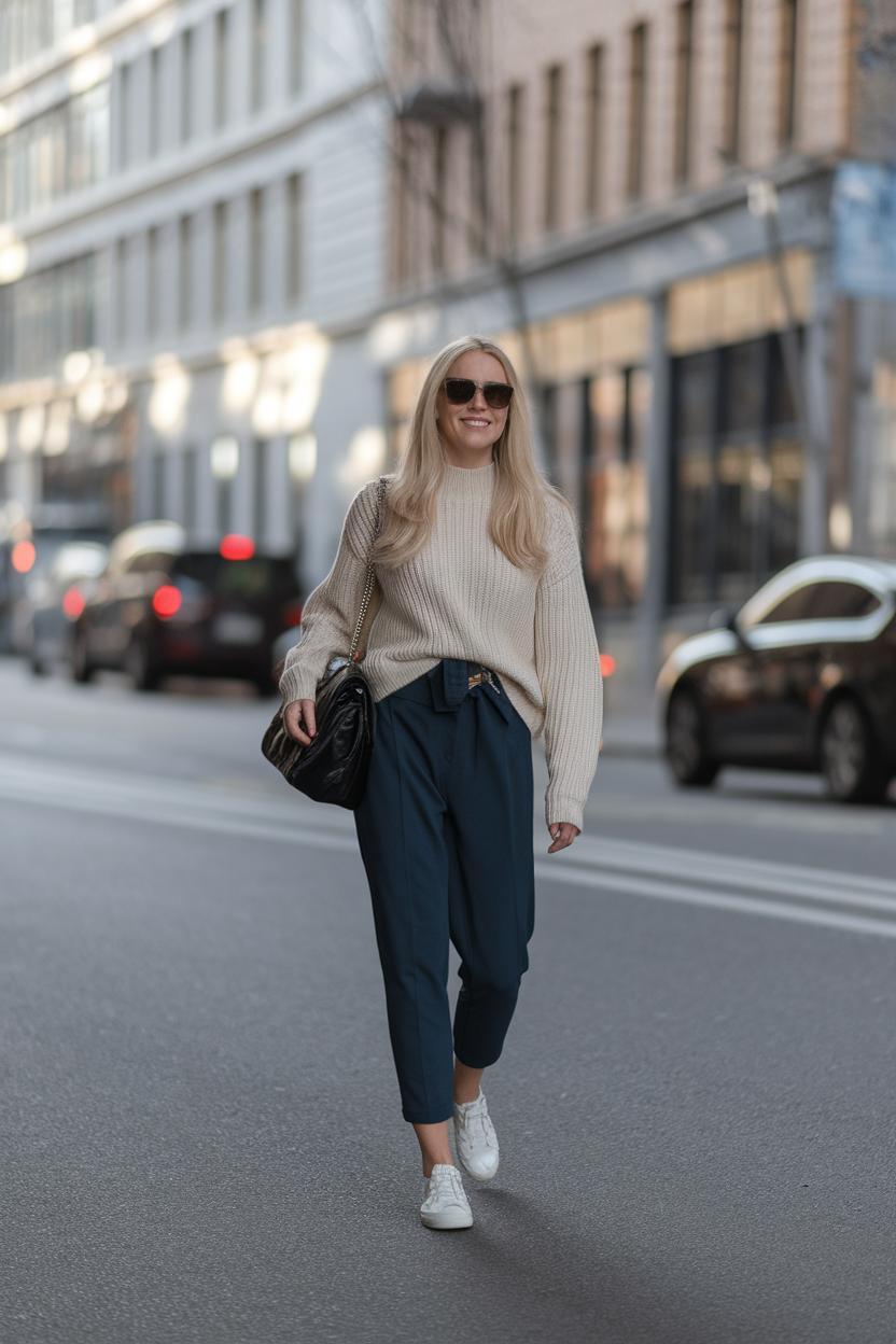Tuck a chunky knit sweater into tailored high-waisted trousers and white sneakers
