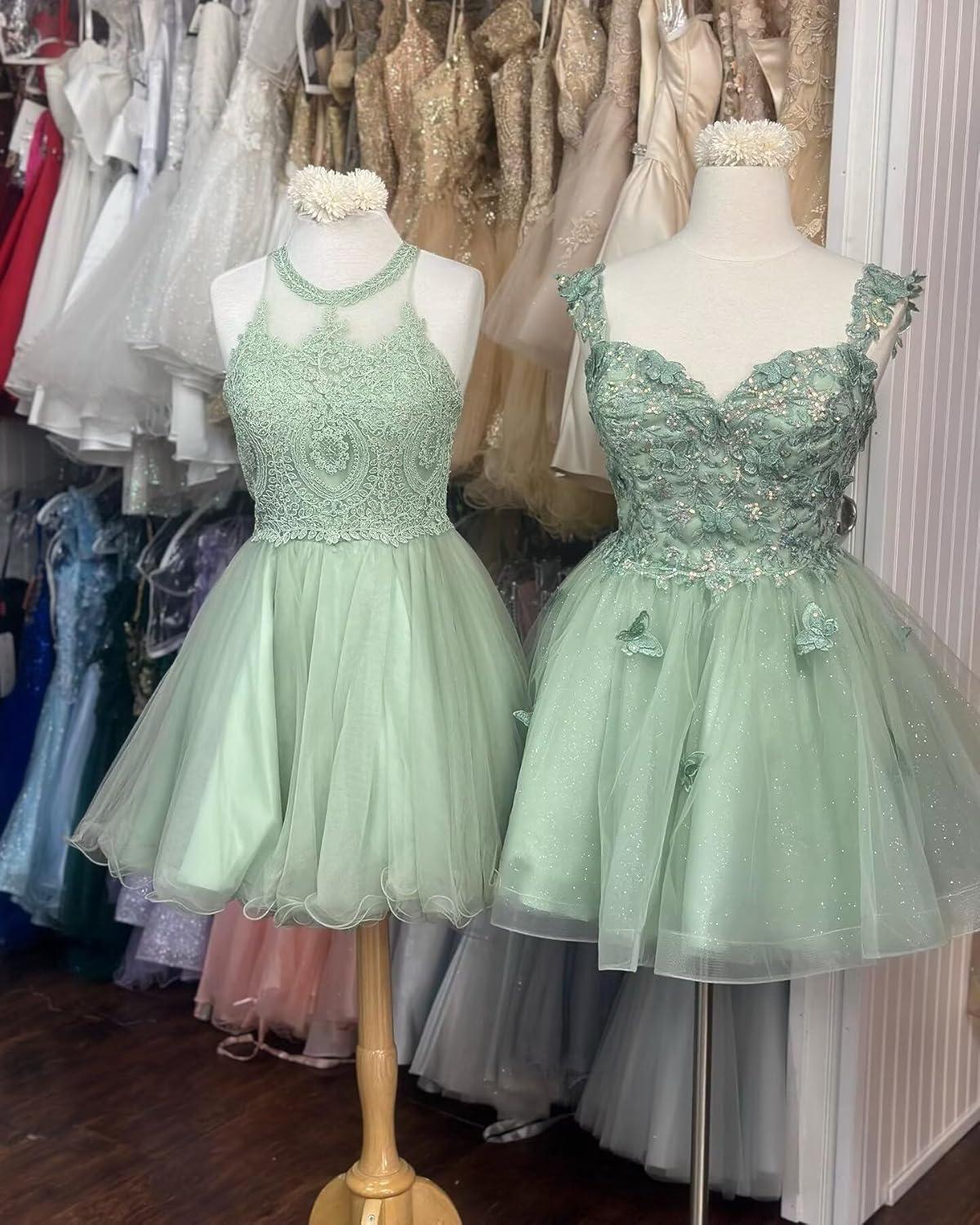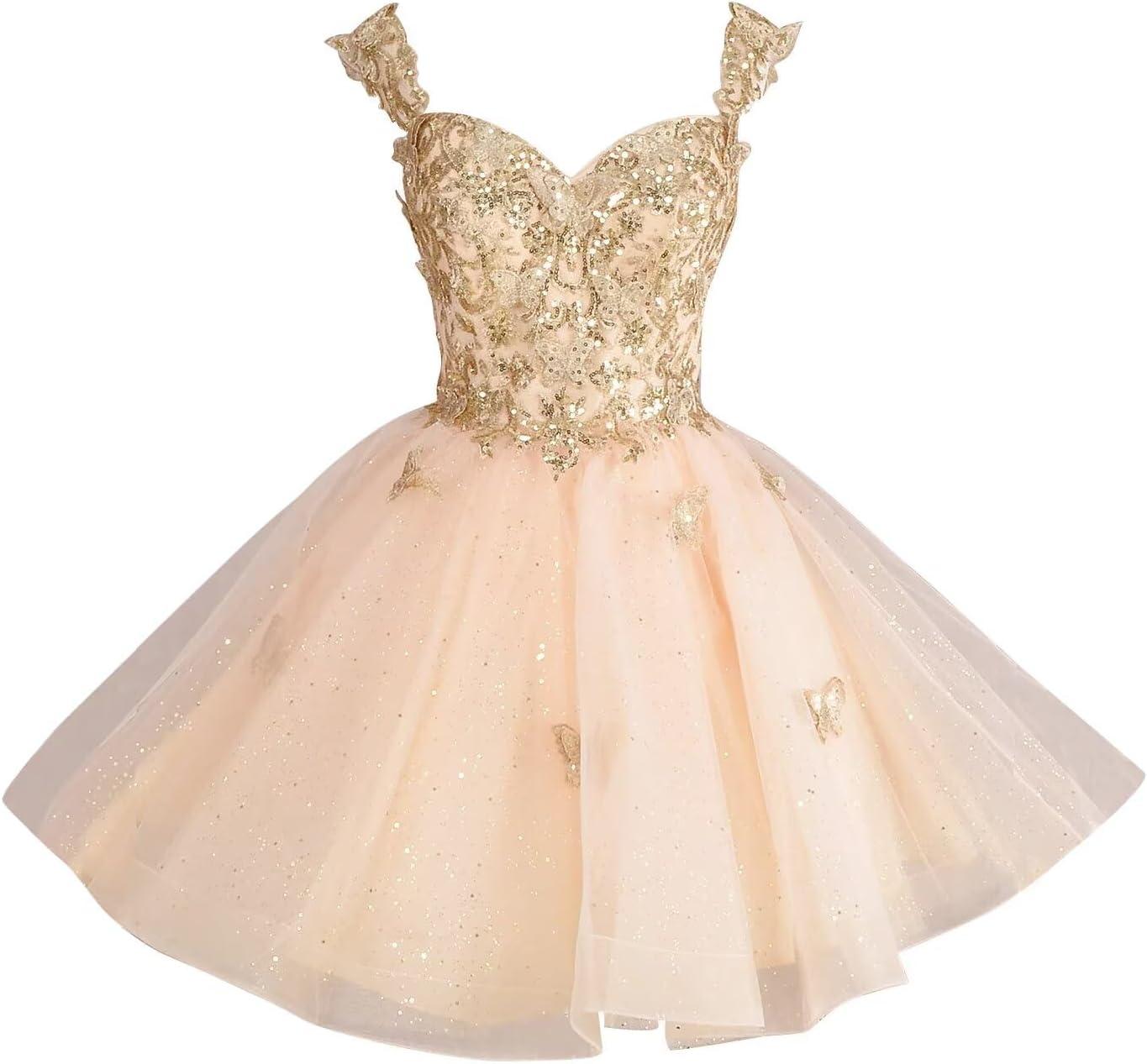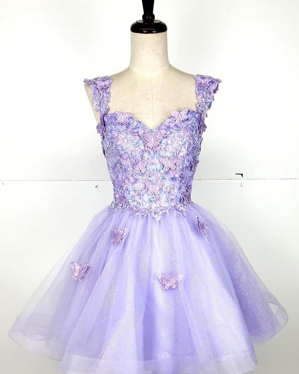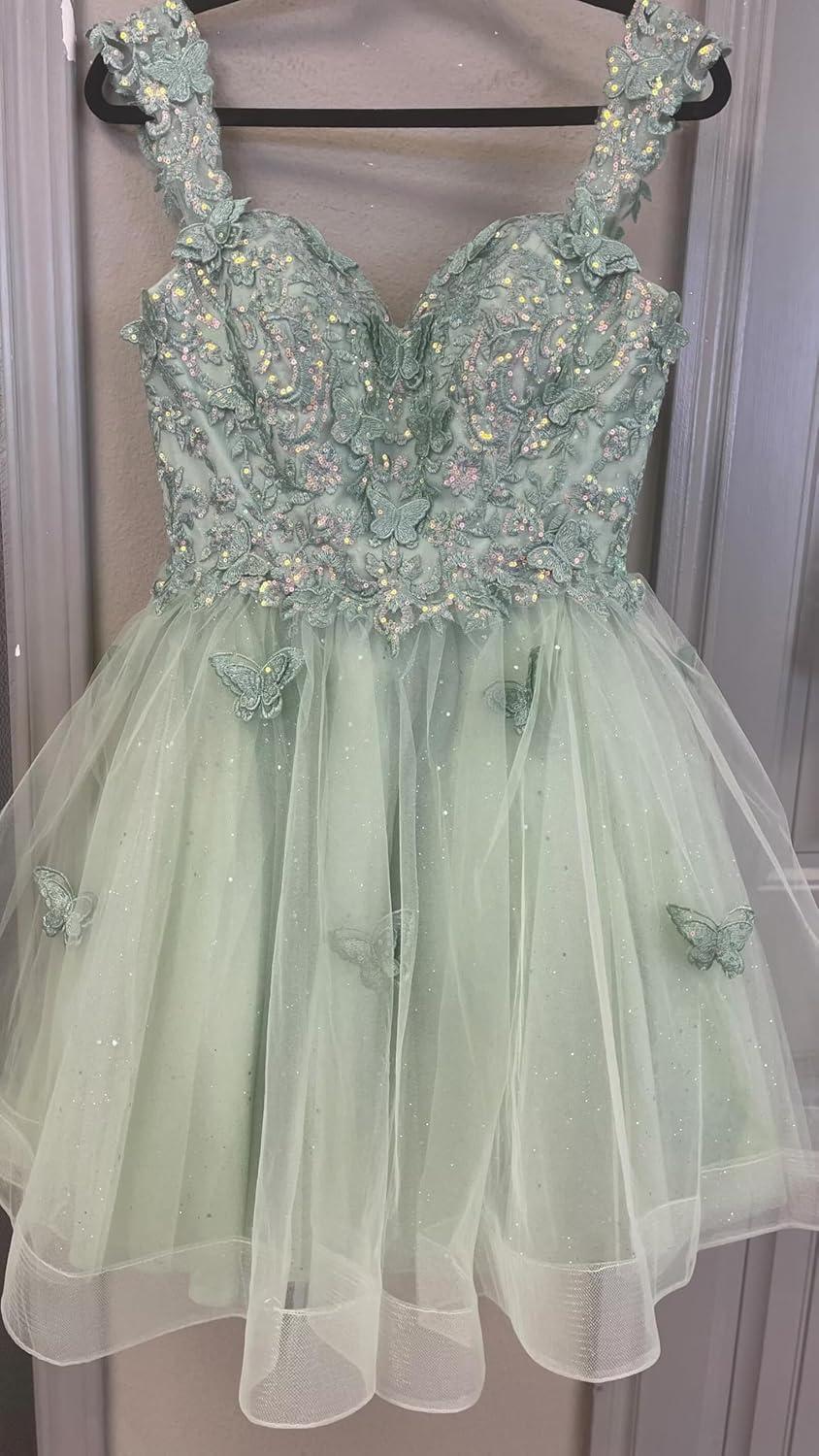 You slip into the 3D Butterfly short puffy tulle mini—officially listed as “3D Butterfly Homecoming Dresses for Teens Short Puffy Tulle Prom dress Sweetheart Mini Cocktail Party Gown”—adn the first thing you notice is how the lined bodice hugs without pinching while the outer tulle feels almost fragile under your fingers. Standing still, the skirt holds a soft, rounded shape thanks to layered tulle and appliqué details; when you take a step the layers catch the air and the glittered surface flashes, but the dress never feels heavy. The seams at the waist sit cleanly, the sweetheart neckline presses gently against your collarbone, and as you sit the skirt compresses into a neat pouf rather than collapsing flat. It’s a garment that announces itself more in movement and texture than in loud structure—light to the touch, subtly structured in silhouette, and immediate in the small, lived-in ways it shifts with you.