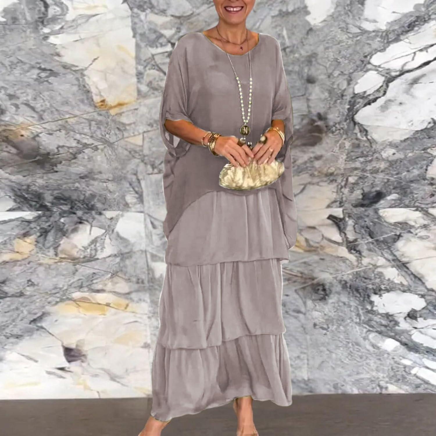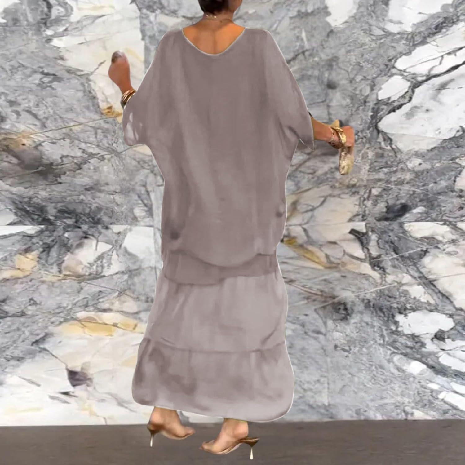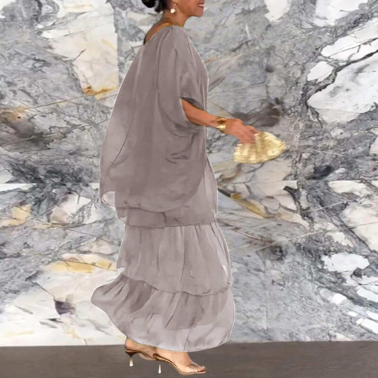 - The chiffon tiering and batwing/3‑4 sleeve shape give the dress noticeable movement — it reads as relaxed elegance for both daytime events and casual cocktail settings.