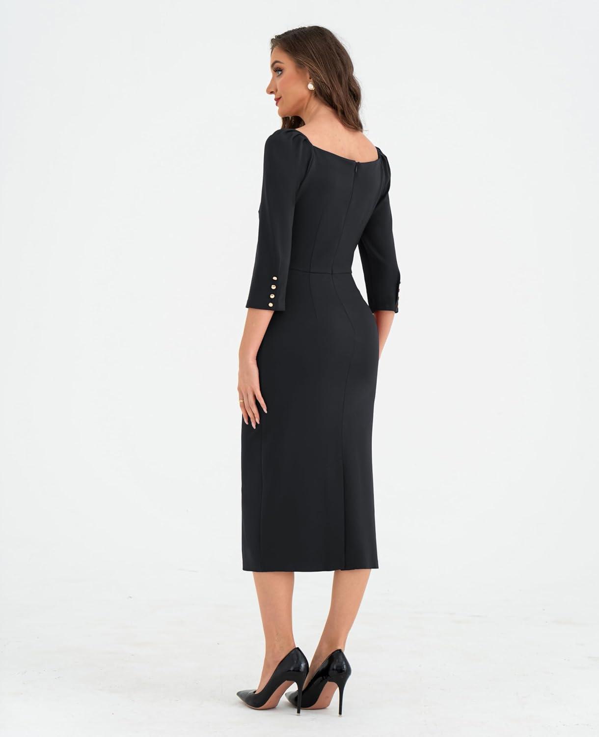 you peel back​ the packing and the dress slips free in a single motion, the black settling into a deep, even tone that catches the⁣ light in places and reads almost matte in ‍others. Held⁤ up by the ‍shoulders,the silhouette is instantly legible: a clean,narrow ⁤line through the⁤ torso and hips‌ with a straight,mid-calf hem that suggests ⁣a tailored fall.Small details ⁢register next—the way the darts ⁢pull toward the waist, a back seam that tracks the center, and the zipper sliding down ‍with a soft, unhurried resistance. The three-quarter sleeves look proportionate when the dress ⁢is suspended, and the neckline frames the hanger⁢ in a ⁤way that ⁢hints at⁢ how it will sit against your clavicle.