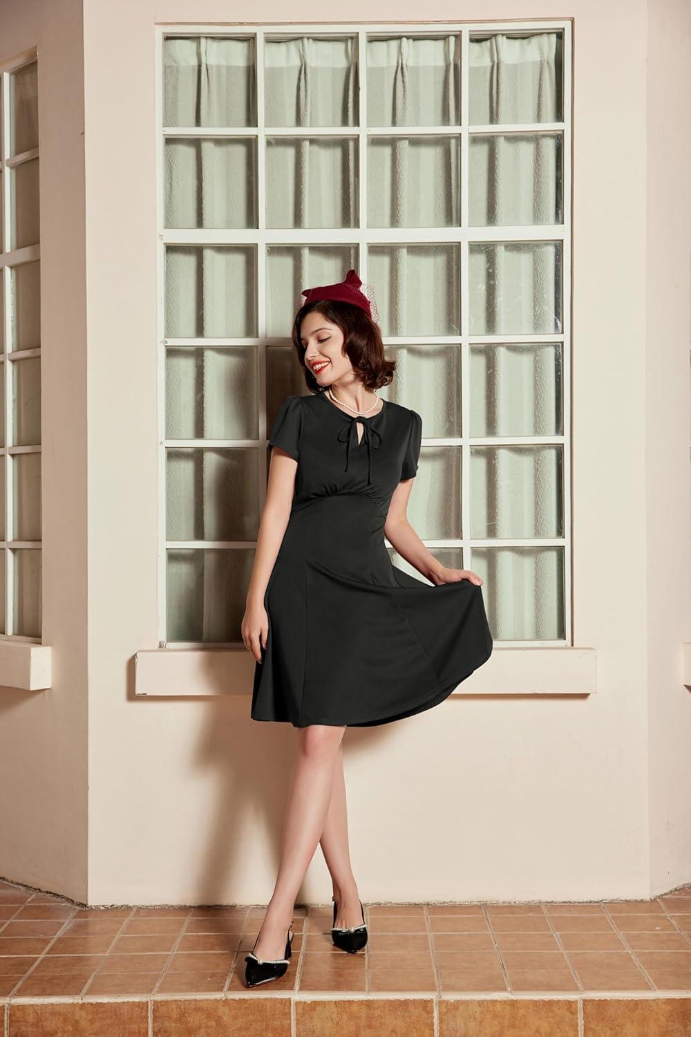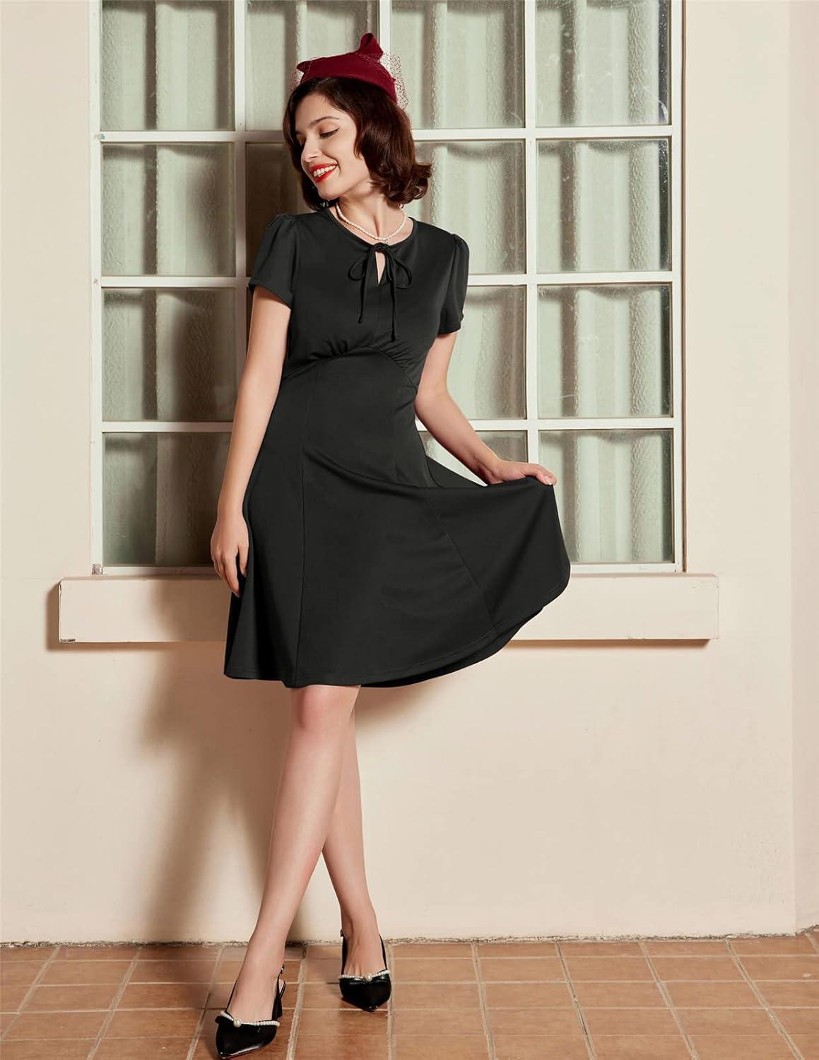 At first you feel the fabric — soft,slightly matte with a gentle stretch that gives as you move. Once you slip into the Belle Poque Retro A-line dress, the waist tucks in just enough and the skirt unfurls into a clean, forgiving swing: it carries a modest visual weight that keeps the silhouette shaped without feeling stiff. The shoulder seams sit flat when you raise your arms and the short sleeves skim rather than bind, and when you sit the hem folds into soft layers instead of bunching. The immediate impression is of a piece that settles around you quietly, its drape and movement revealing themselves in ordinary motions.