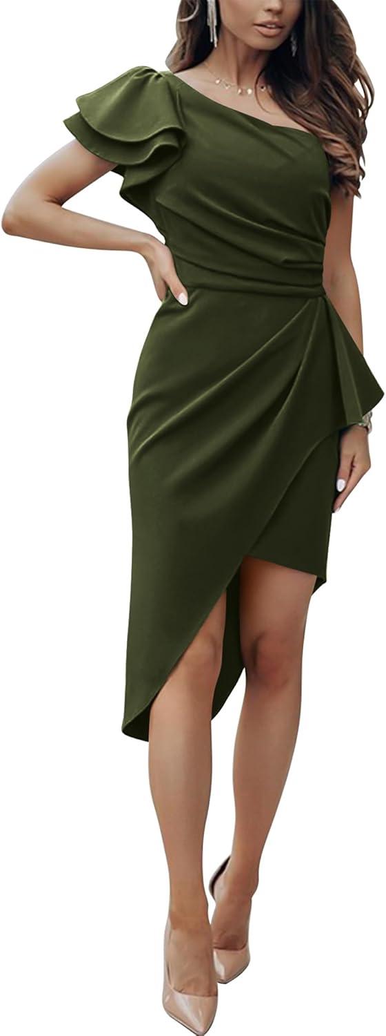 Light picks out a faint sheen along the shoulder ruffle as you turn, and the fabric responds with a slow, tactile drape. You slip into the BTFBM Women 2025 Summer Fashion Elegant One Shoulder Cocktail Dress Ruffle Sleeve Wrap Ruched Bodycon Short Party Dresses — the BTFBM one-shoulder ruffle-wrap — and feel a modest, stretchy weight that sits close without being stiff. The ruching forms tidy folds that soften as you move, the wrap hem dropping heavier on one side so the silhouette shifts when you walk and settles flatter when you sit. Seams lie smooth against your hips and the sleeve grazes your arm; in motion the dress reads composed rather then floaty.
