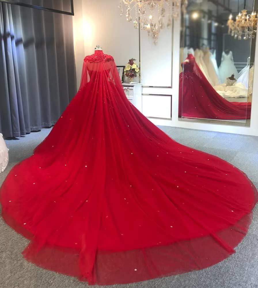 There is an undeniable charm that the cape adds, effortlessly transforming the entire silhouette into something truly majestic.the delicate lace and sequin embellishments on the cape seamlessly complement the sweetheart neckline and the beaded bodice, creating a harmonious balance between intricate detail and smooth fabric flow. It’s not just about aesthetics - the cape drapes elegantly over the shoulders, adding a layer of grace while offering a subtle cover that enhances comfort during cooler moments or outdoor photos. This fusion of ornate craftsmanship and wearable design elevates the dress beyond a typical ball gown, crafting a regal look that remains practical without sacrificing style.