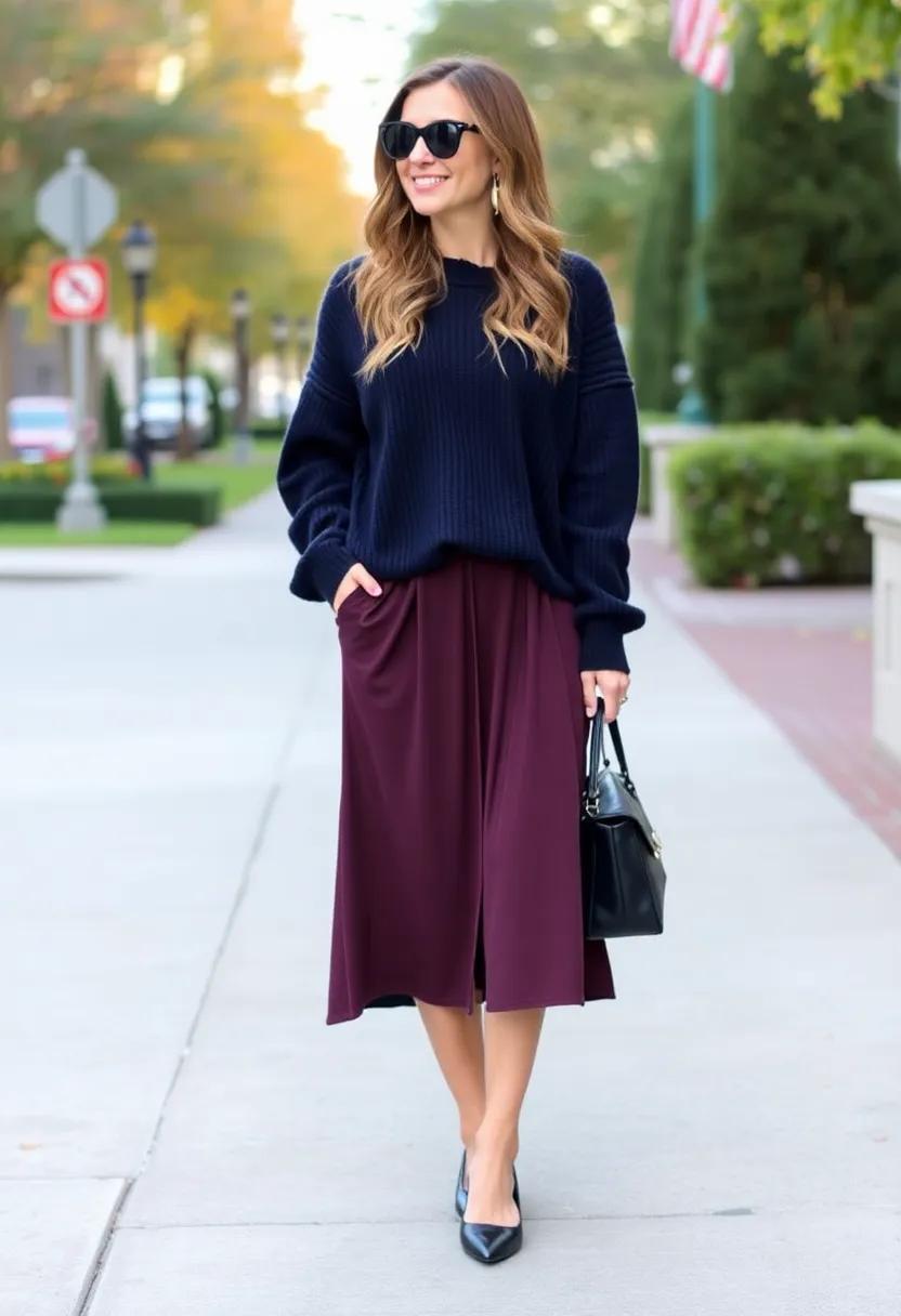 - Denim:  A classic high-waisted denim skirt offers a casual vibe that complements the relaxed fit of a sweater perfectly.
