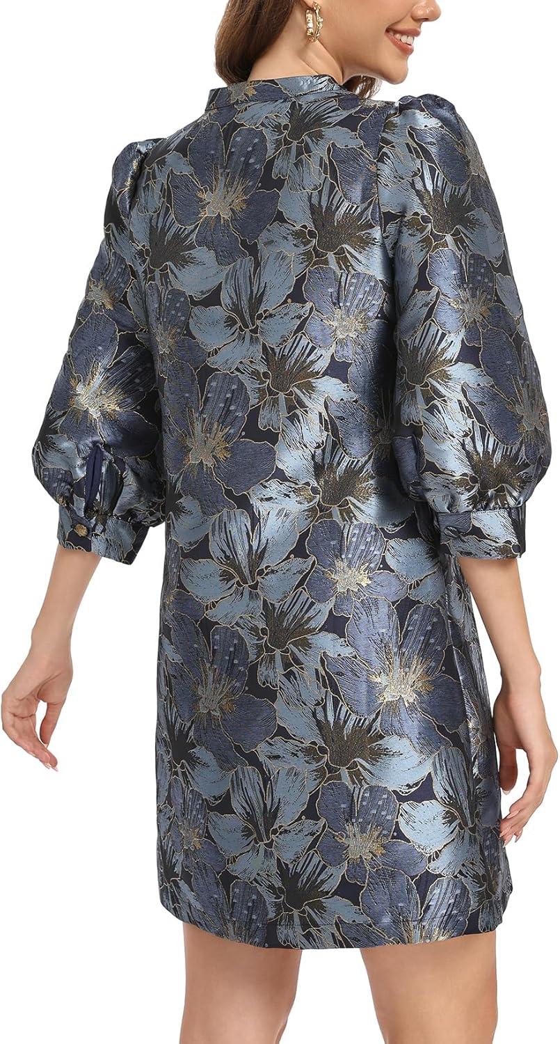 The long puff sleeves add a touch of romantic elegance, giving the dress a unique silhouette that softly balances volume and structure. They create a gentle statement without overwhelming the floral jacquard fabric, perfectly framing the arms for an effortlessly chic appeal. Thes sleeves elevate the dress beyond a simple shift, lending it a vintage-inspired sophistication that works beautifully for cocktail parties and more formal occasions alike. Their length also provides versatility, allowing the dress to transition seamlessly from cooler evenings to daytime events.