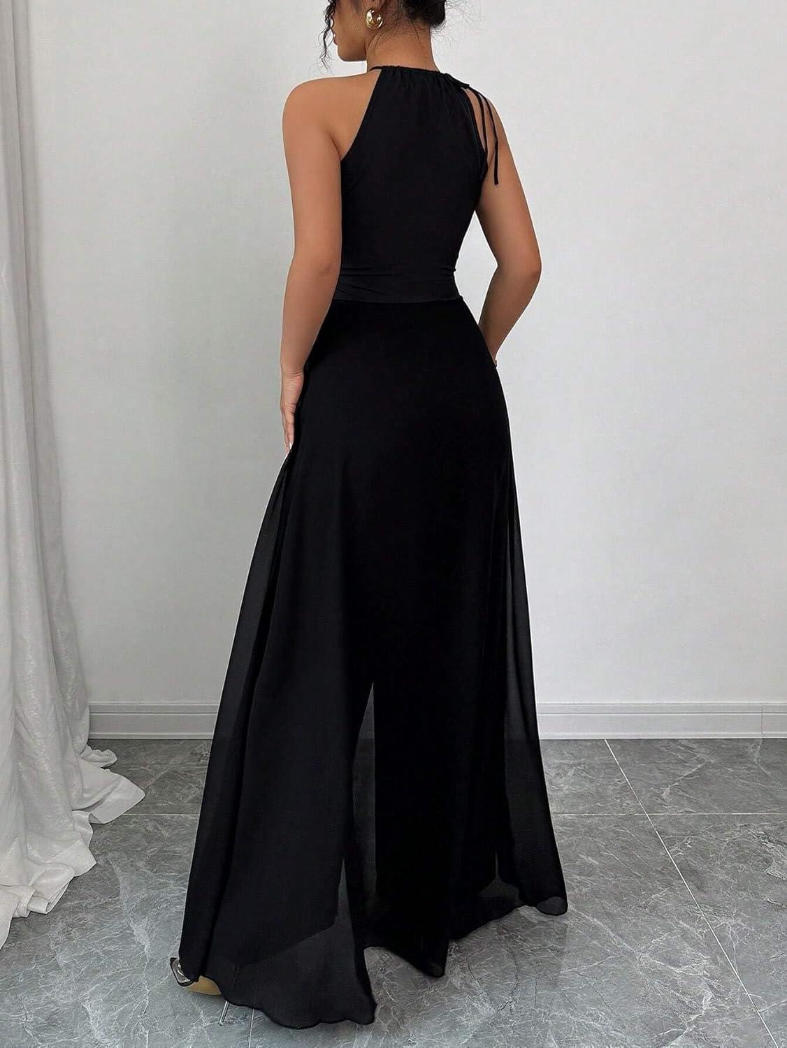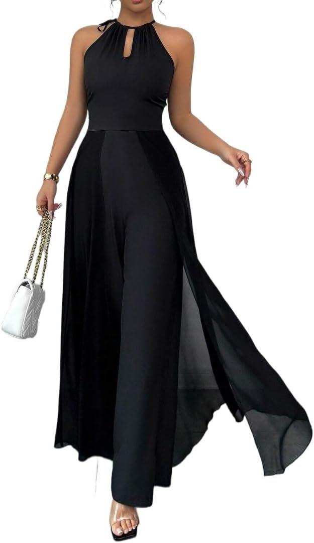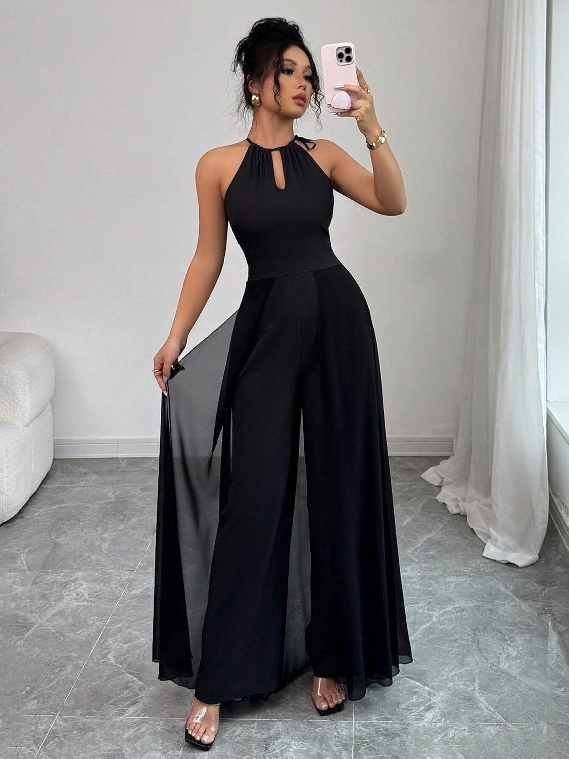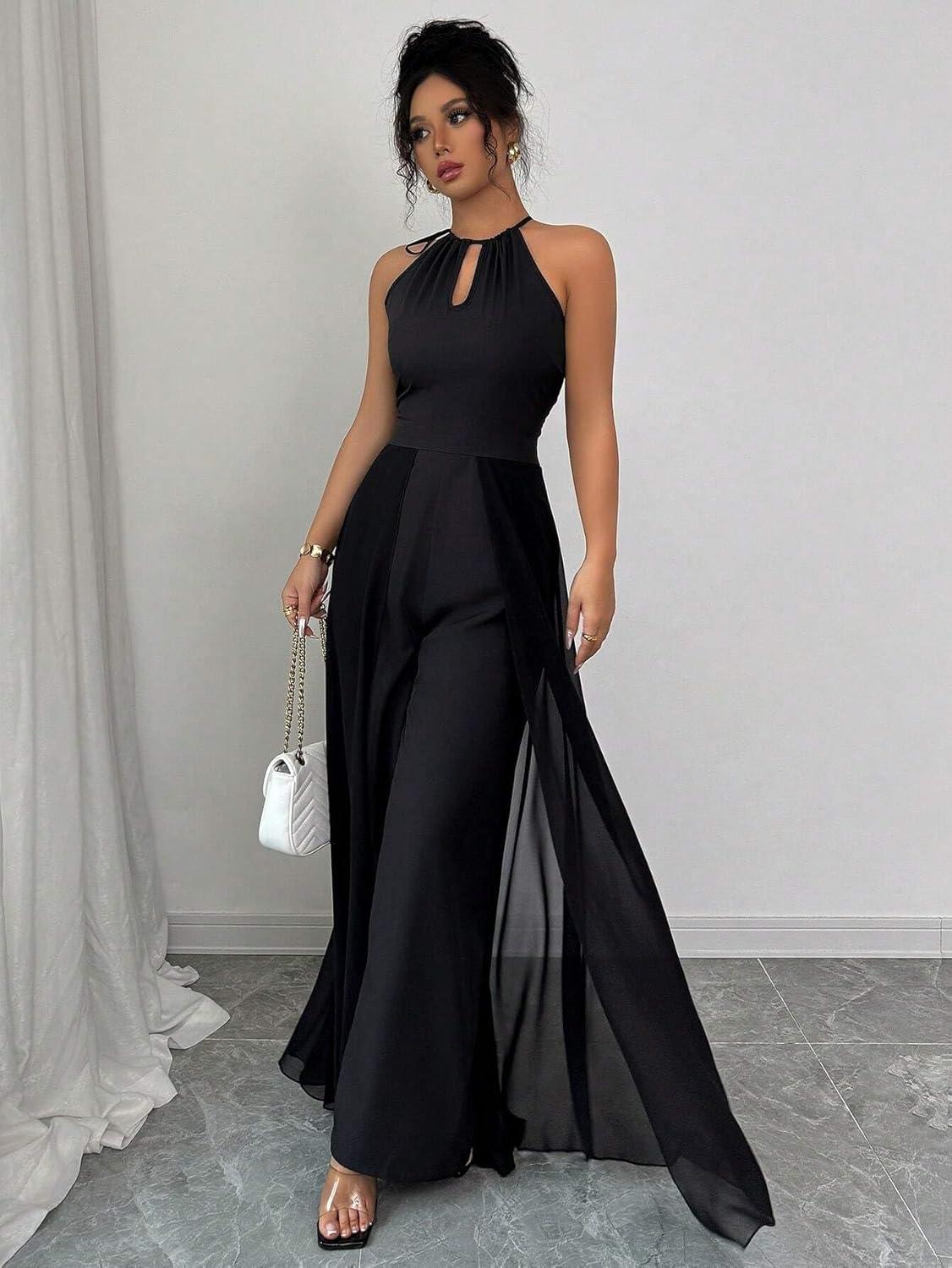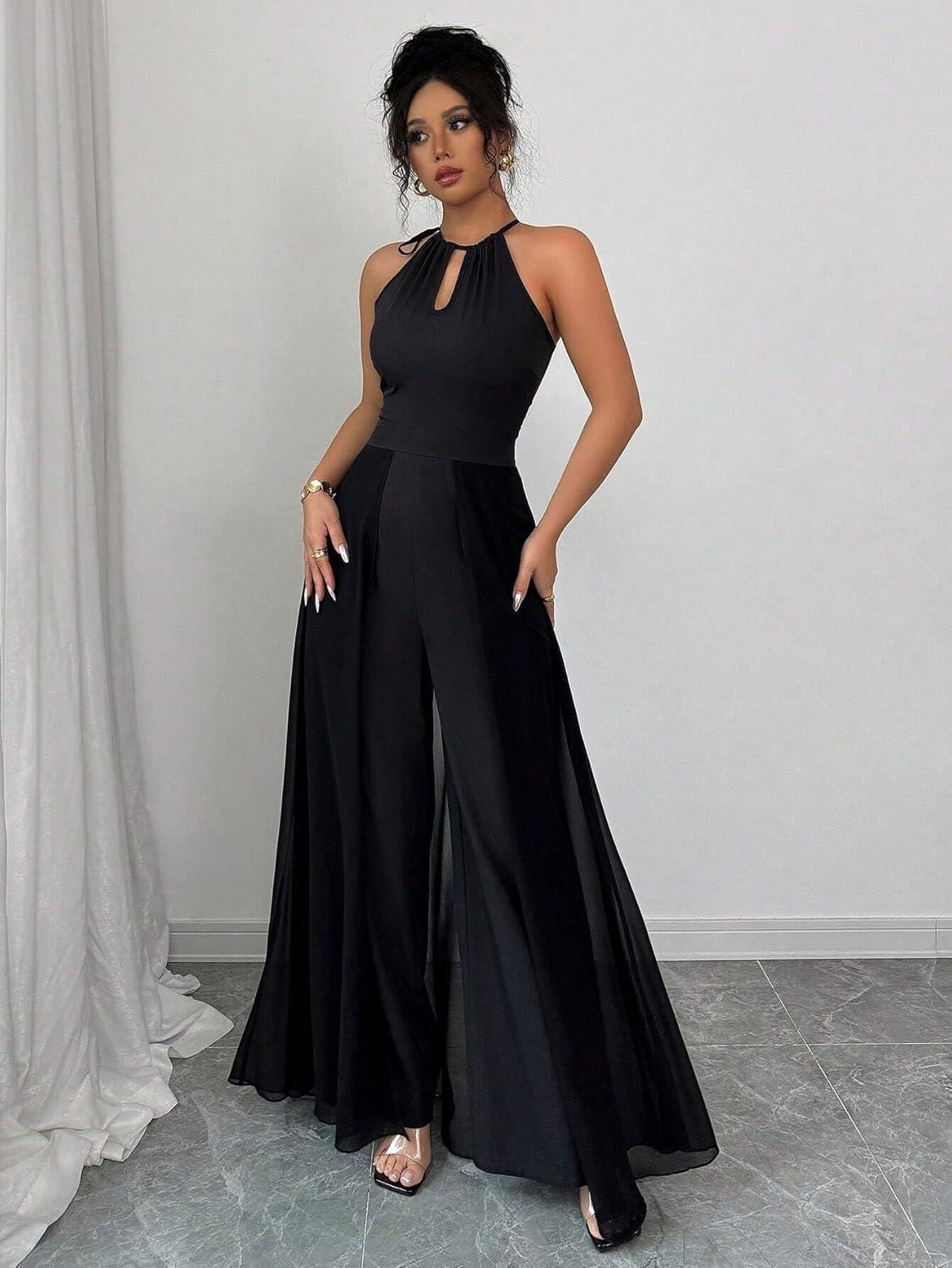 This elegant piece is ideal for women who appreciate a blend of style and sophistication without sacrificing comfort. Perfect for those seeking a versatile outfit that transitions seamlessly from day to night, it flatters various body shapes thanks to its waist-cinching design and timeless halter neckline. Whether you’re attending a summer party, a casual work event, or a chic dinner date, this romper’s sheer chiffon overlay and tailored fit make it a standout choice for any occasion.