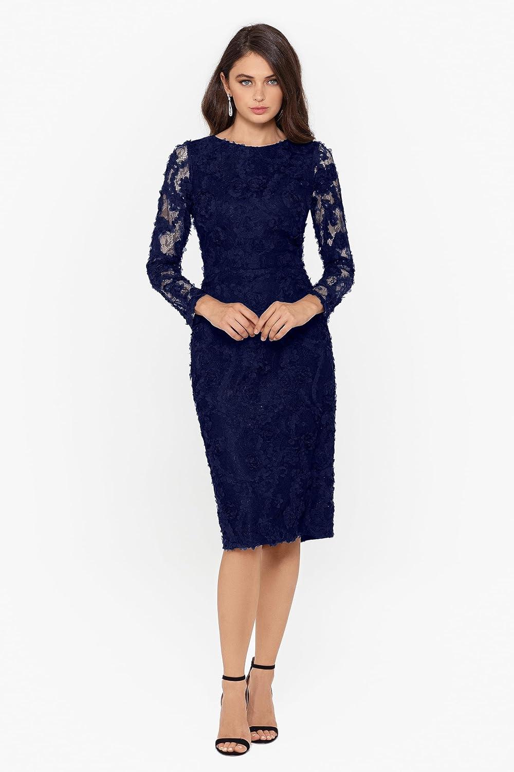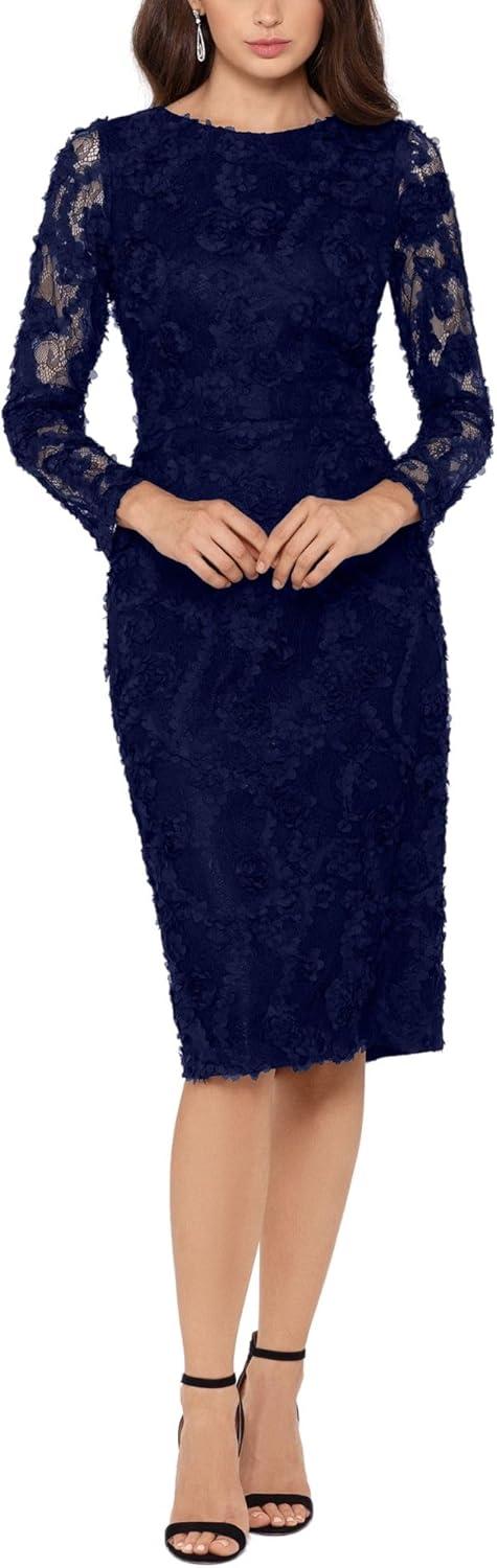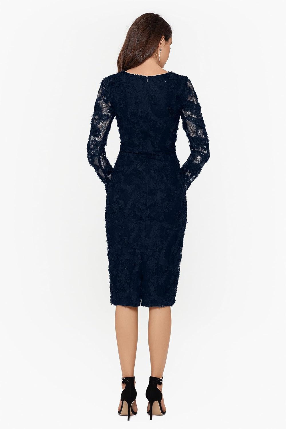 When placing this sheath dress alongside other formal wear in our collection, it impresses with its delicate lace detailing and sleek silhouette. Unlike many dresses that lean heavily on bold colors or heavy embellishments, this option embraces understated elegance, making it versatile for both formal occasions and more relaxed evening events. The long sleeves add a refined touch that distinguishes it from sleeveless cocktail dresses, offering both style and subtle coverage, which we found ideal for transitional seasons.