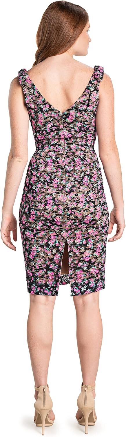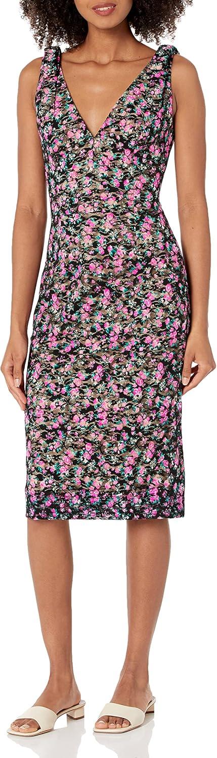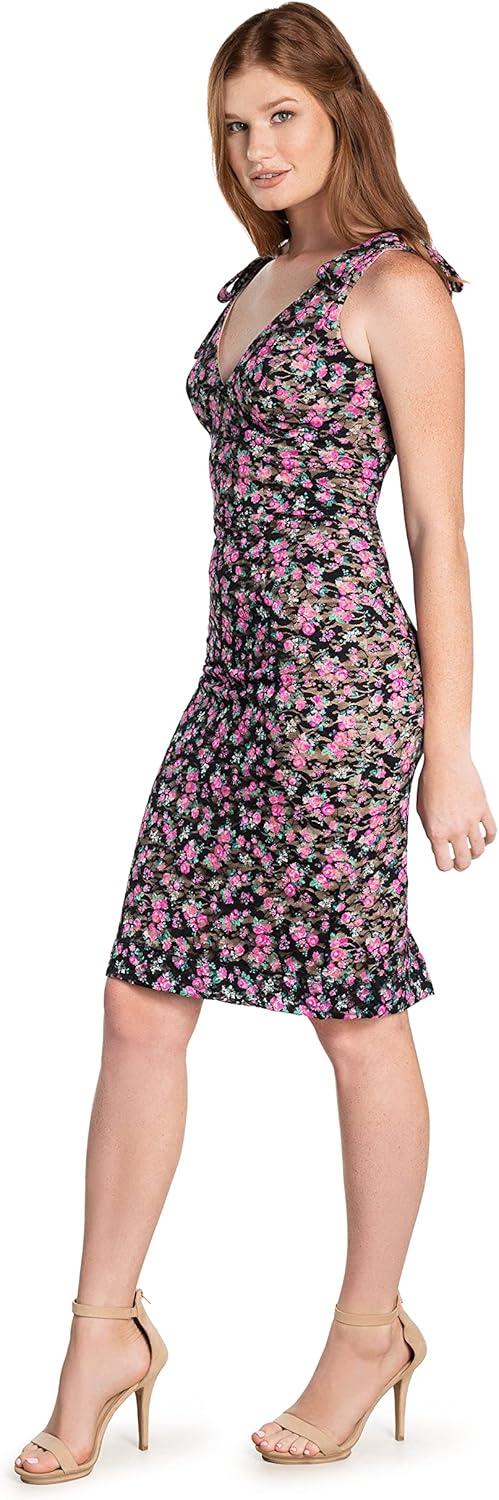 You slide into Dress the Population’s Mary dress and the fabric is the first thing you register: a midweight, gently elastic knit that smooths over curves without feeling clingy. The bow-tied shoulders settle into place as the plunging neckline opens, and the bodycon cut keeps a defined hourglass line while the midi hem hangs with a calm, measured drape. When you walk the skirt follows in a steady, contained sway; when you sit the seams ease and the material relaxes into soft folds rather than puckering. Under indoor light the black‑multi reads as subtle depth, so those first few minutes of movement—turning, pausing, shifting weight—are what reveal how the dress actually behaves.