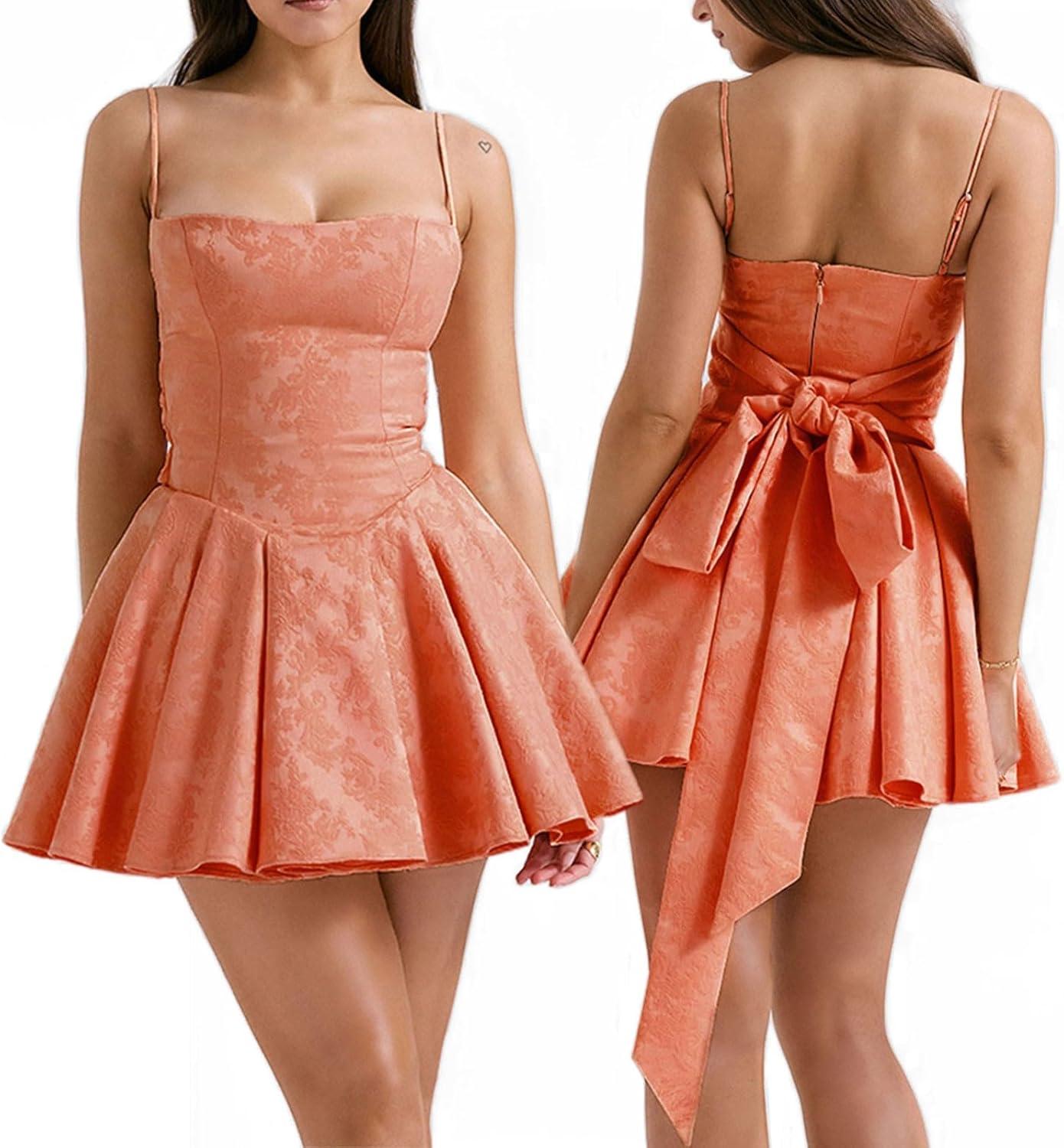 When you first see it in person, the satin jacquard gives you a subtle, two-tone shimmer that changes with movement — not mirror-gloss, but a refined sheen that reads dressy without shouting. Up close the woven pattern adds texture, so the light catches the motifs and the silhouette holds a little structure at the waist and skirt; the bowknot and sleeveless cut keep the look youthful and easy to layer. On the body it feels cool and slightly slick to the touch, which helps the skirt glide as you walk; the mini length makes it a clear choice for nights out, parties, or a dressed-up weekend.