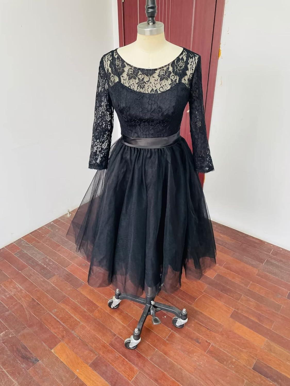 This dress features a graceful A-line silhouette that flatters a variety of body types, offering both comfort and elegance.The tea-length design strikes a perfect balance between complex and playful, making it ideal for cocktail parties, proms, or any semi-formal occasions. Delicate lace sleeves add a touch of refinement, while the intricate lace pattern throughout the dress creates a timeless aesthetic that never goes out of style.