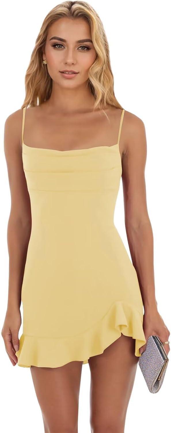 When it comes to makeup and hairstyle, soft yet polished choices create the perfect balance.We recommend a dewy, natural makeup look with warm eyeshadow tones and a subtle highlighter to bring out your features without clashing with the dress’s light yellow hue. For hairstyles,loose waves or a neat low bun highlight the spaghetti strap neckline beautifully,keeping the focus on the dress’s clean lines and ruffled accents. Don’t forget to tailor your size perfectly using the detailed measurements to ensure that flattering, body-hugging fit that makes all the difference.