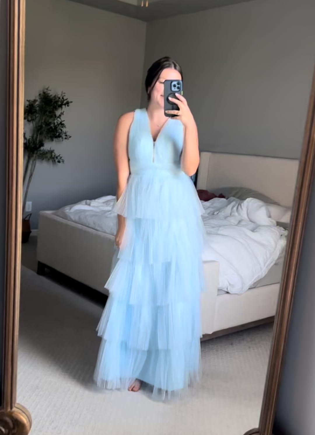 Wearing this elegant gown truly felt like stepping into a dream. The lightweight tulle fabric added an ethereal float as we moved, enhancing the overall grace and presence the dress offers. The deep V-neckline combined with delicate ruffles beautifully framed the upper body, creating a sophisticated yet playful look.One of the standout features was the long backless design, which added a touch of daring glamour without sacrificing comfort. The classic A-line silhouette gently skimmed the waist and flared out, ensuring a flattering fit for many body types. Its formal vibe was perfect for an evening occasion, whether it was a prom, party, or any special event that called for a little extra sparkle.