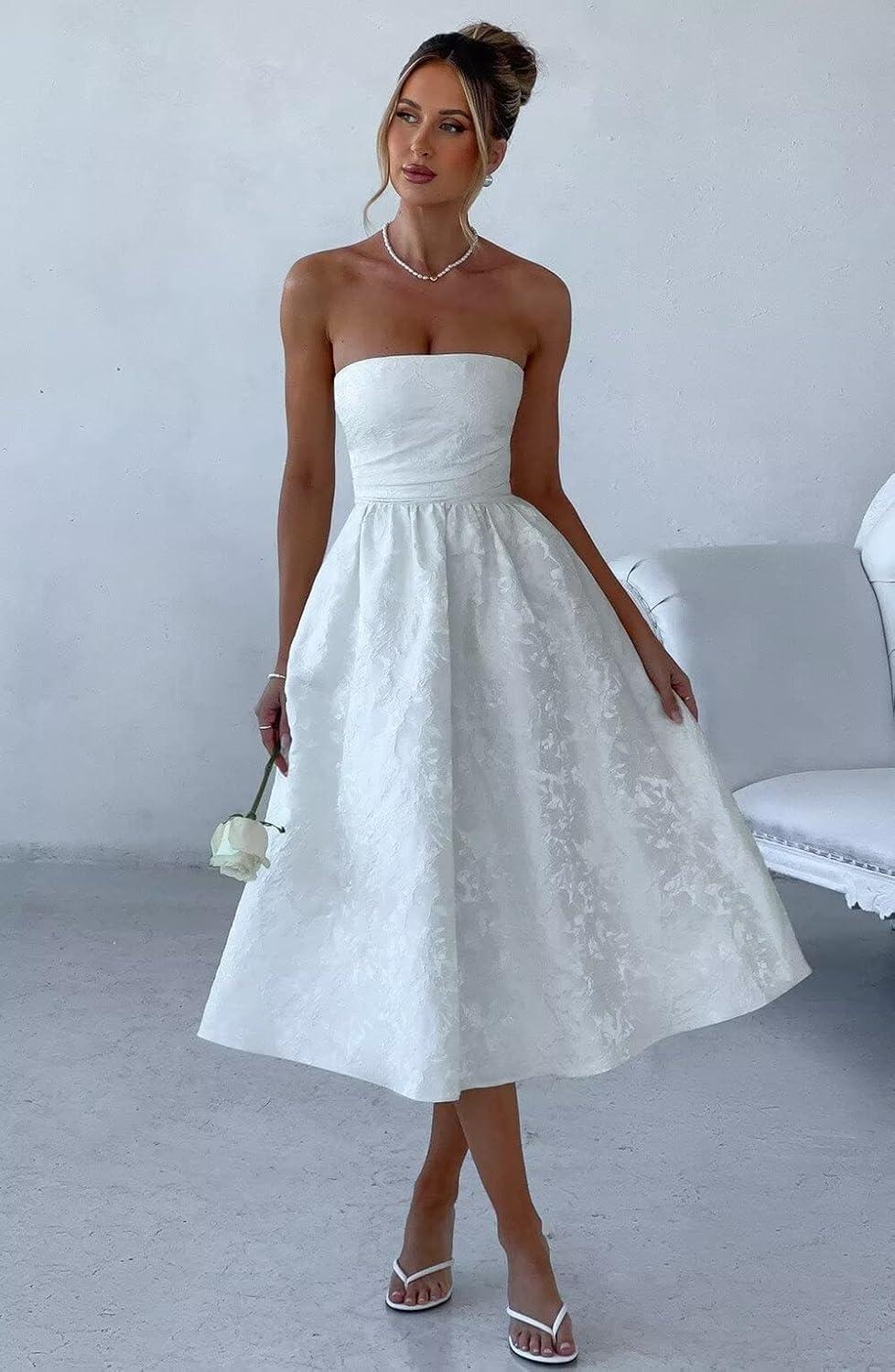 To truly let the intricate floral jacquard pattern stand out, we recommend keeping accessories minimal yet elegant. Opt for delicate jewelry such as thin gold or silver chains,small stud earrings,and dainty bracelets to avoid competing with the dress’s detailed texture. Since the dress features a strapless design, a subtle necklace or a choker can beautifully frame the neckline without overwhelming the look. We also love pairing this dress with neutral-toned heels or sandals that complement the white base, allowing the floral patterns to remain the focal point of your ensemble.