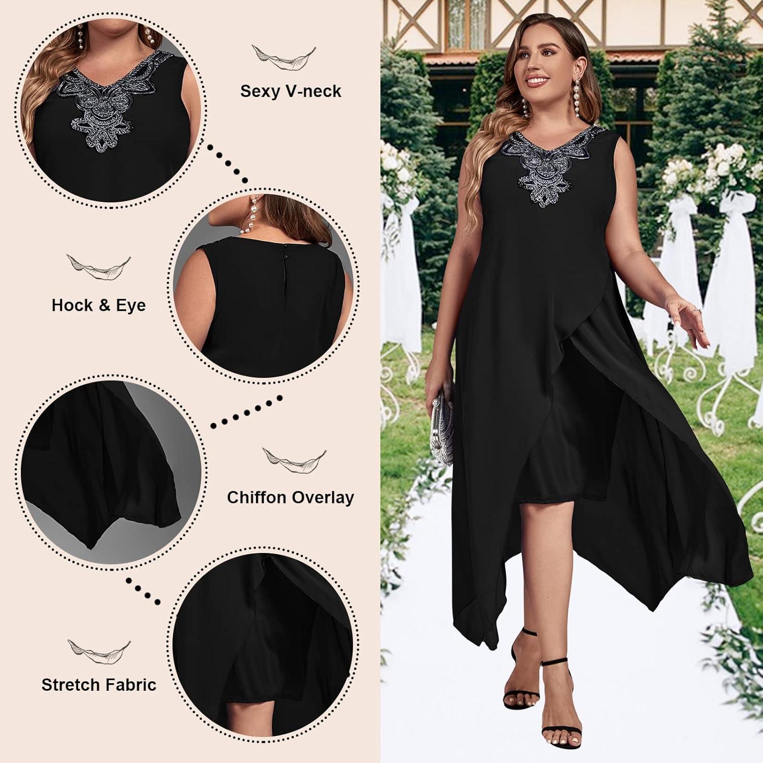 | flattering plus size design that accentuates curves with a slimming effect | The chiffon overlay may require gentle care to avoid snags or pulls |