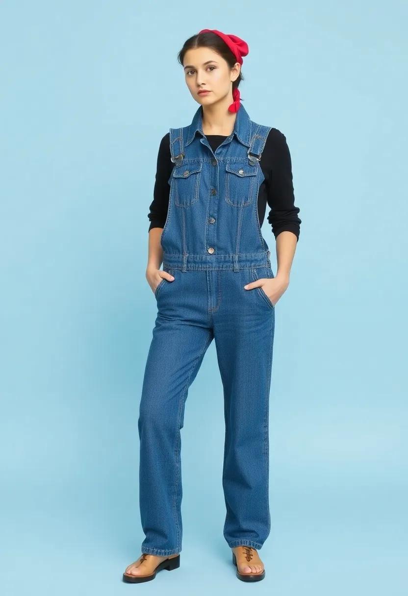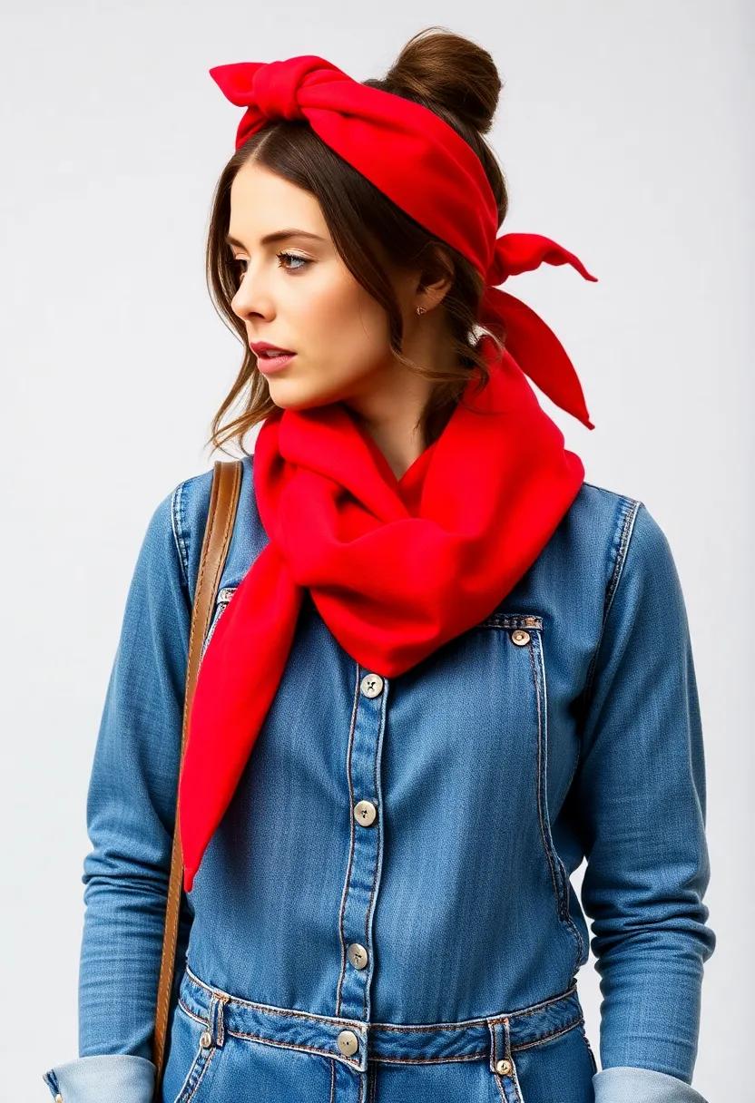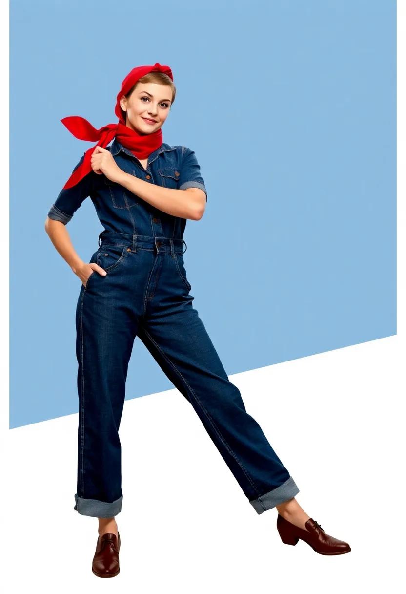 Empowering Fashion: Rosie the Riveter Denim Overalls Paired with a Bold Red Scarf