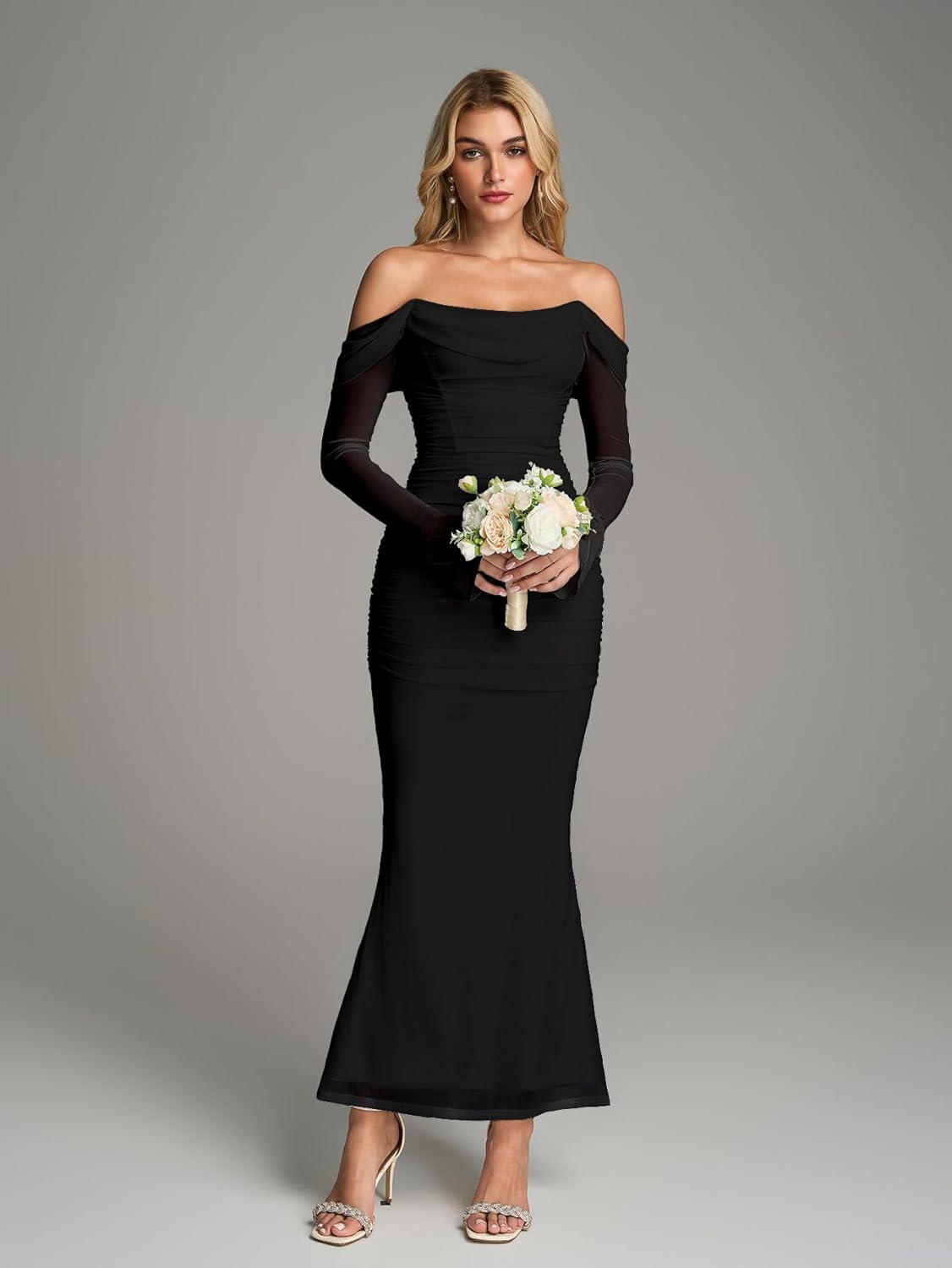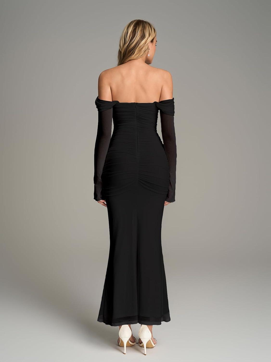 From a movement perspective, the ruched fabric offers a slight stretch and flexibility, allowing for smooth motion during events like cocktail parties or weddings. The interplay between the off-shoulder neckline and the ruched midsection complements the sheer long sleeves, balancing femininity with structure. This detail ensures the dress stays comfortable and stylish throughout the evening, adapting seamlessly to different poses and dance moves.Below is a quick look at how ruched detailing benefits us in wearability and style: