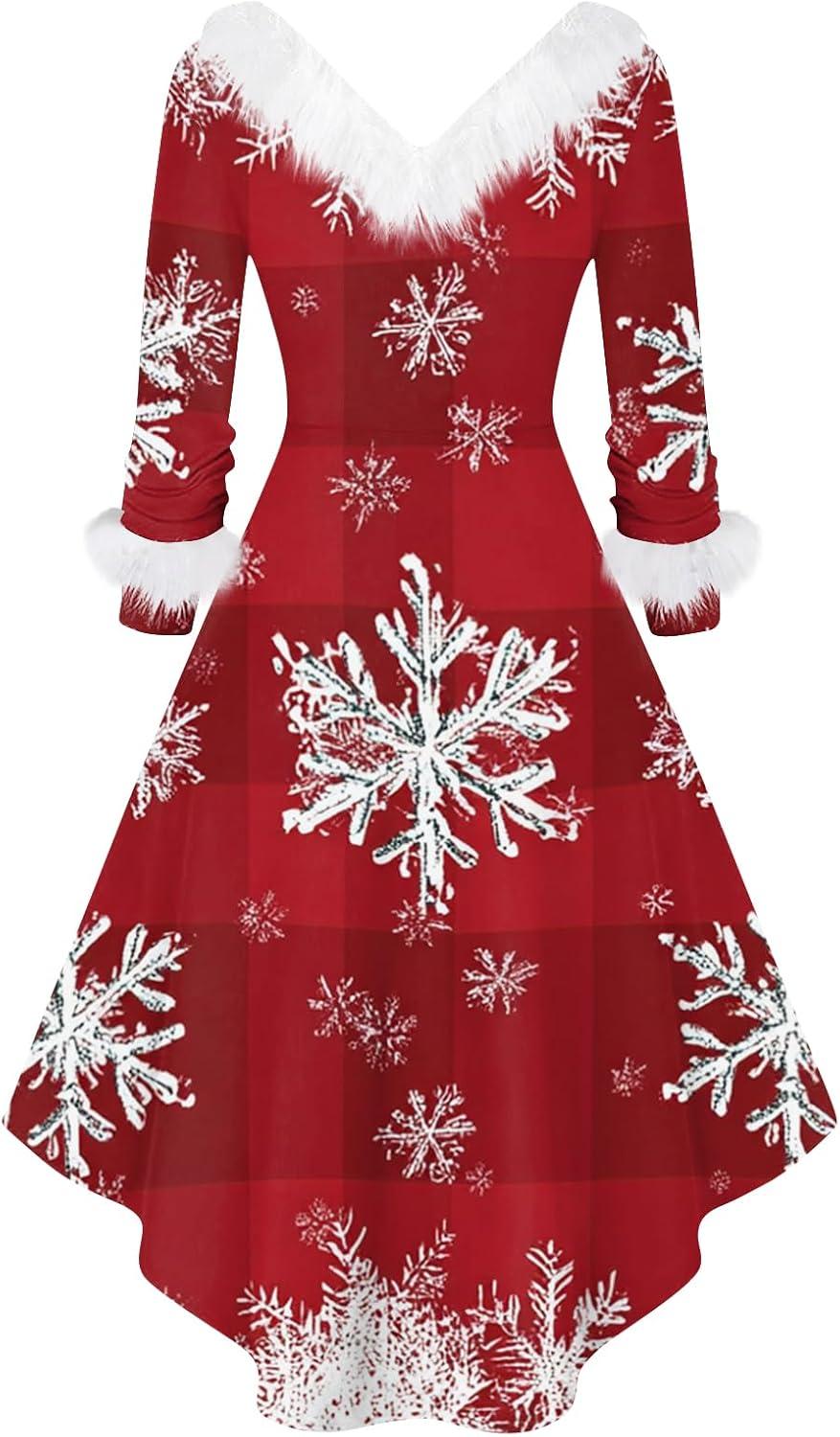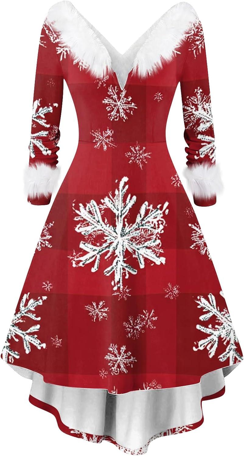 As we wrap up our festive exploration, it’s clear that the Women’s Christmas Dresses vintage V Neck Faux Fur Trim Cocktail Dress beautifully captures the spirit of the season with its charming vintage vibe and cozy details. Whether you’re attending a holiday party or simply want to add a touch of Christmas magic to your everyday wardrobe, this dress offers both comfort and style in sizes that flatter a variety of silhouettes. With its charming faux fur trim and playful Christmas prints, it’s a delightful choice that brings warmth and cheer to any occasion.