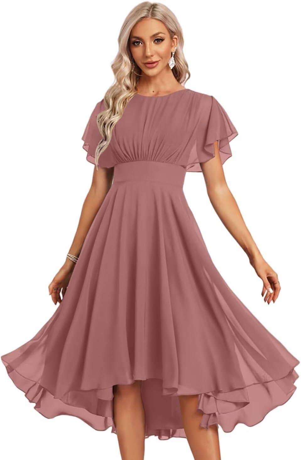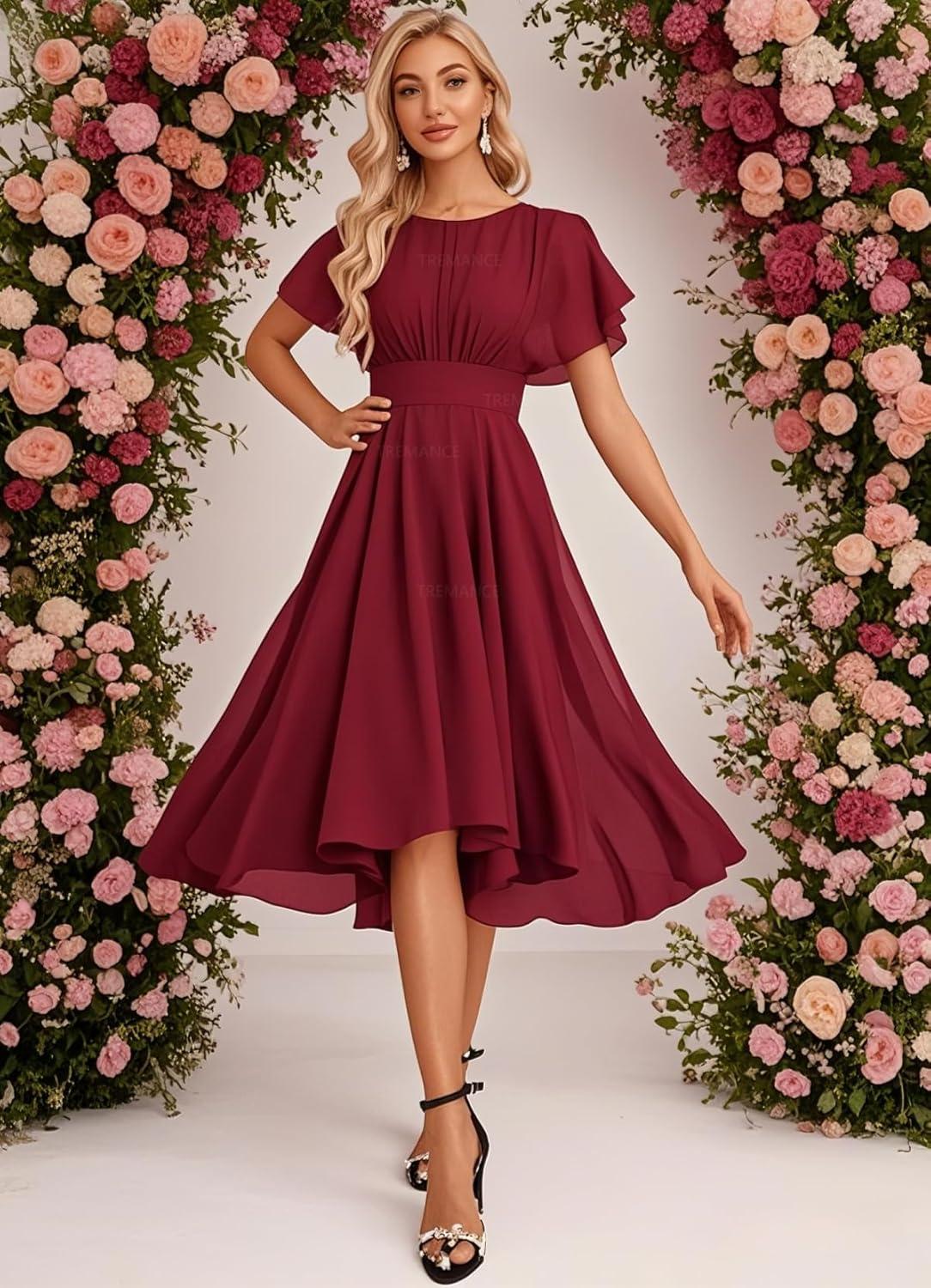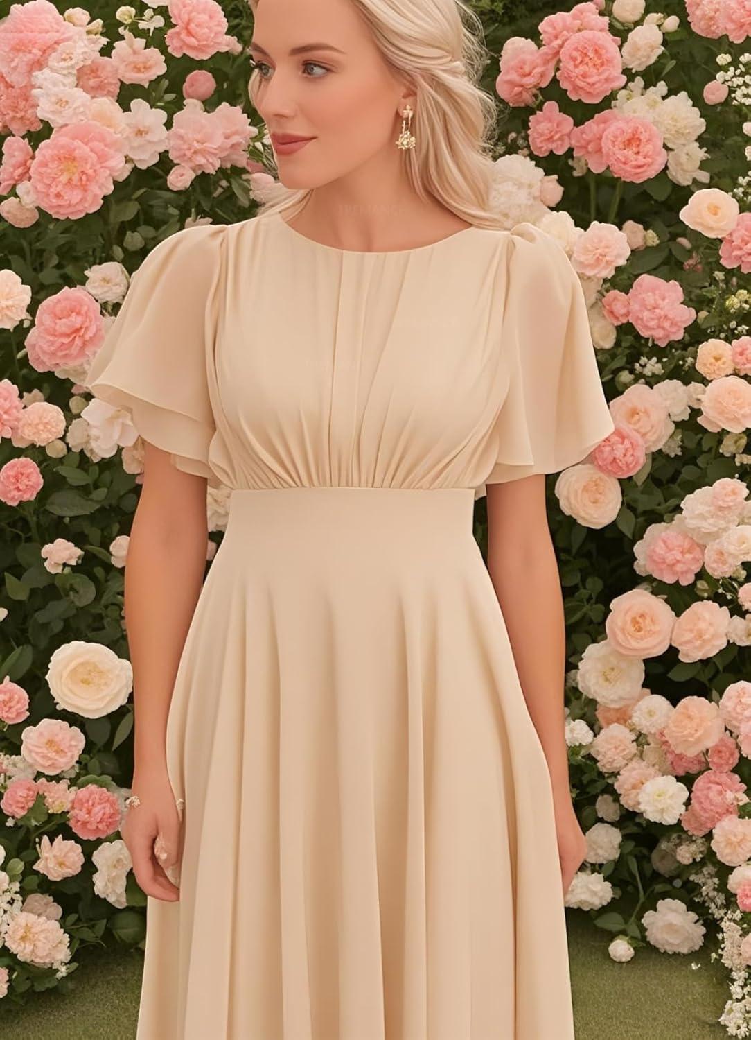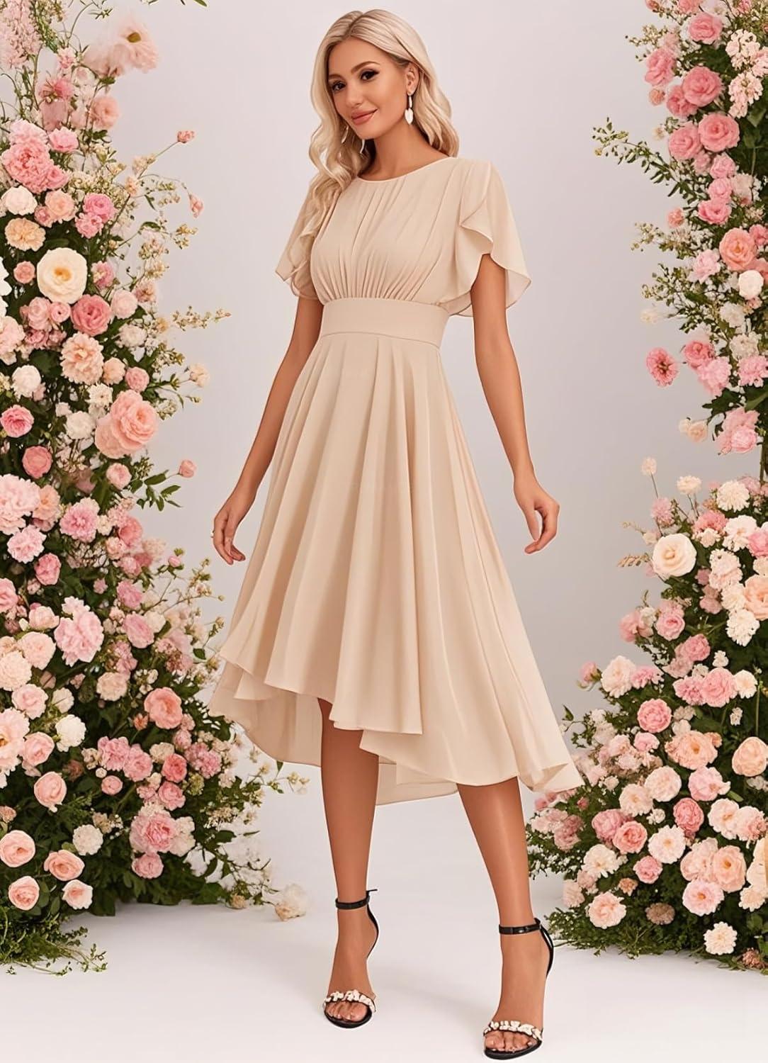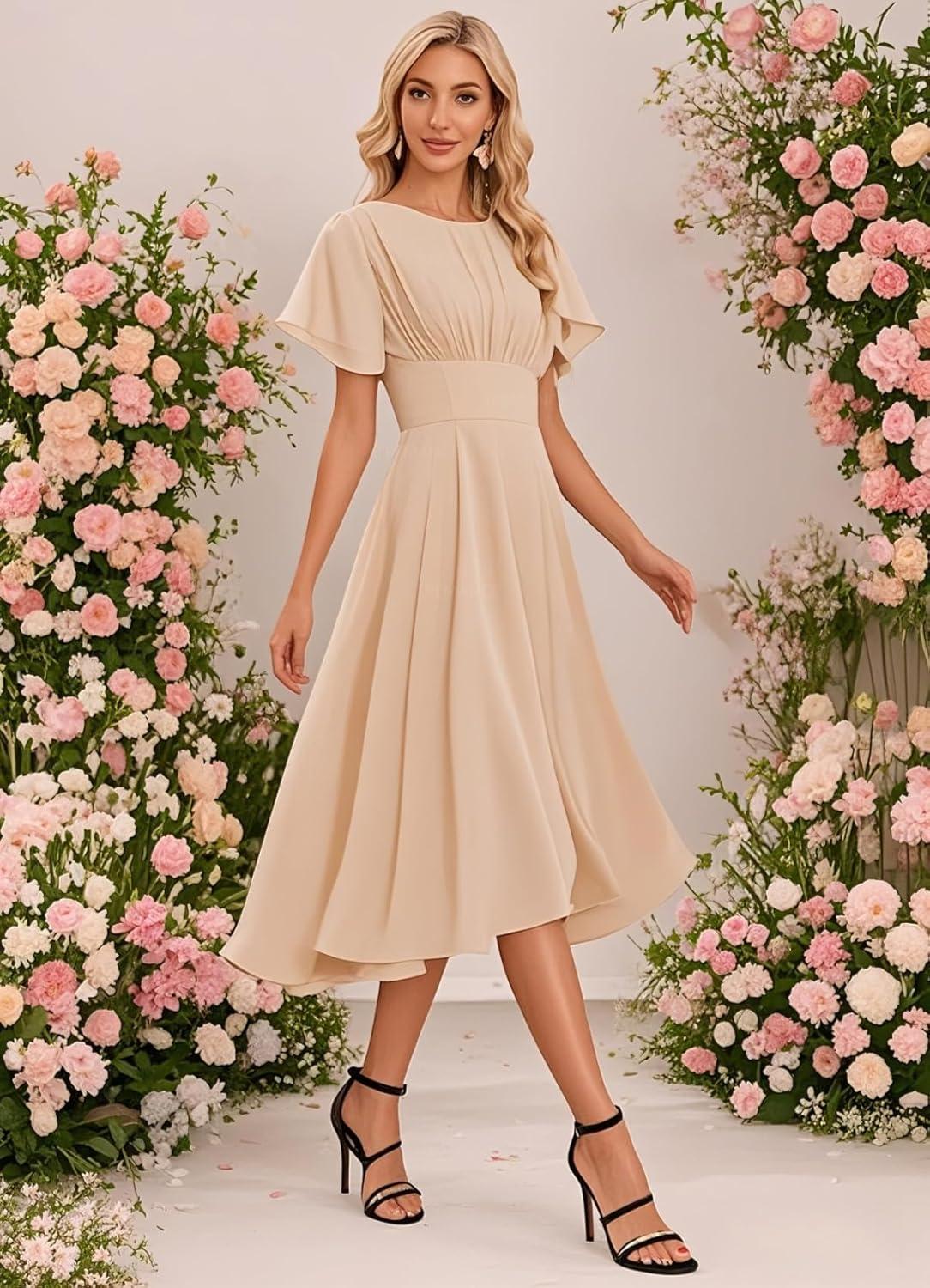 For weddings and formal parties, the soft chiffon fabric paired with the flutter sleeves offers an effortlessly elegant vibe that works beautifully in both indoor and outdoor settings. The tea-length cut strikes a perfect balance between classic and contemporary, allowing us to move gracefully while showcasing our footwear choices, whether it’s delicate heels or stylish flats. We found that accessorizing with minimalistic jewelry and a subtle clutch enhances the dress’s refined silhouette without overpowering it. The gentle drape and subtle blush tone complement a wide range of skin tones, making it a versatile option for mixed wedding palettes.
