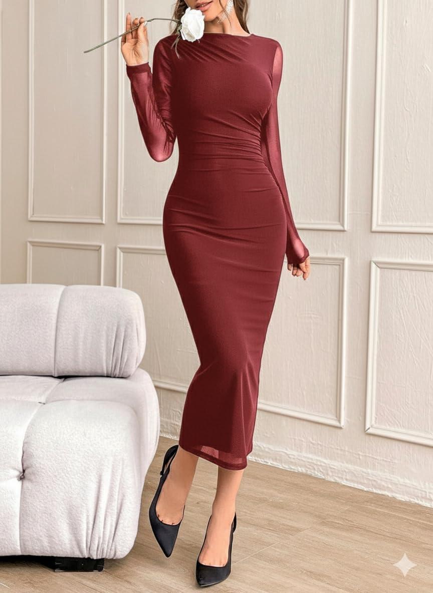 This dress perfectly blends elegance with a modern, bodycon silhouette that enhances the natural curves without sacrificing comfort. Its layered mesh fabric, enhanced by tasteful ruching, provides a flawless balance between sophistication and a subtle allure. The long sleeves add versatility, making it a great option for cooler evenings or transitional seasons. The cinched hem gracefully frames the hips and thighs, creating a refined, elongated look that works wonderfully for cocktail events, dinner dates, or upscale gatherings.