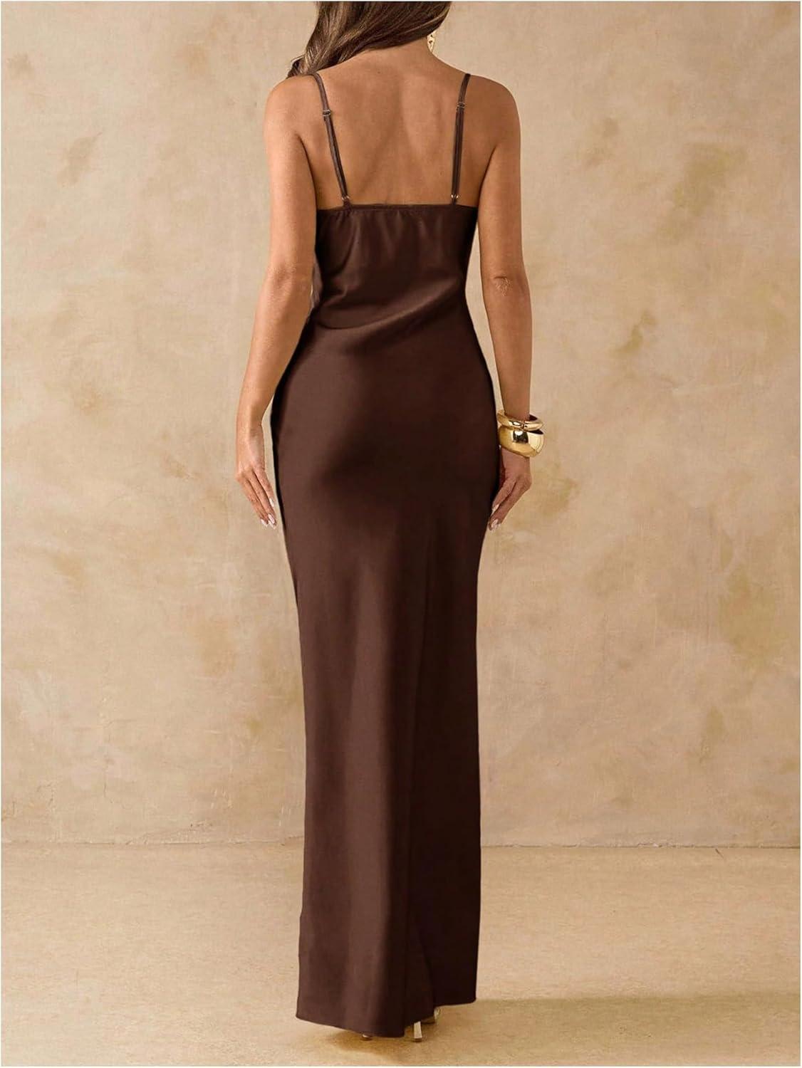 This elegant satin cocktail dress captivates with its sleek, bodycon silhouette and delicate spaghetti straps, creating a timeless look that gracefully blends sophistication and femininity. The V-neckline adds just the right amount of allure without overshadowing its refined charm, making it an ideal choice for wedding guests or any upscale evening event. Its maxi length lends a versatile, flattering fit that elongates the figure, while the satin fabric brings a subtle sheen that catches the light beautifully, enhancing the dress’s luxurious appeal.