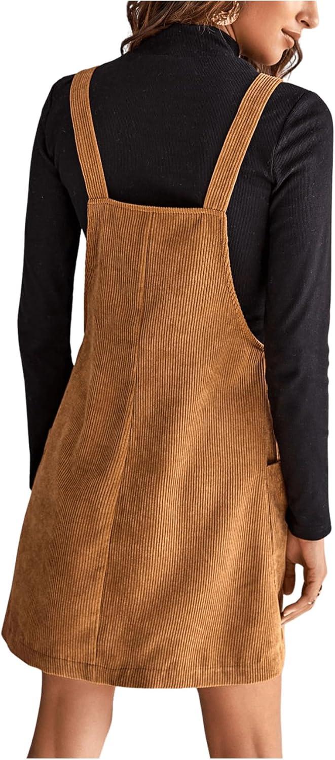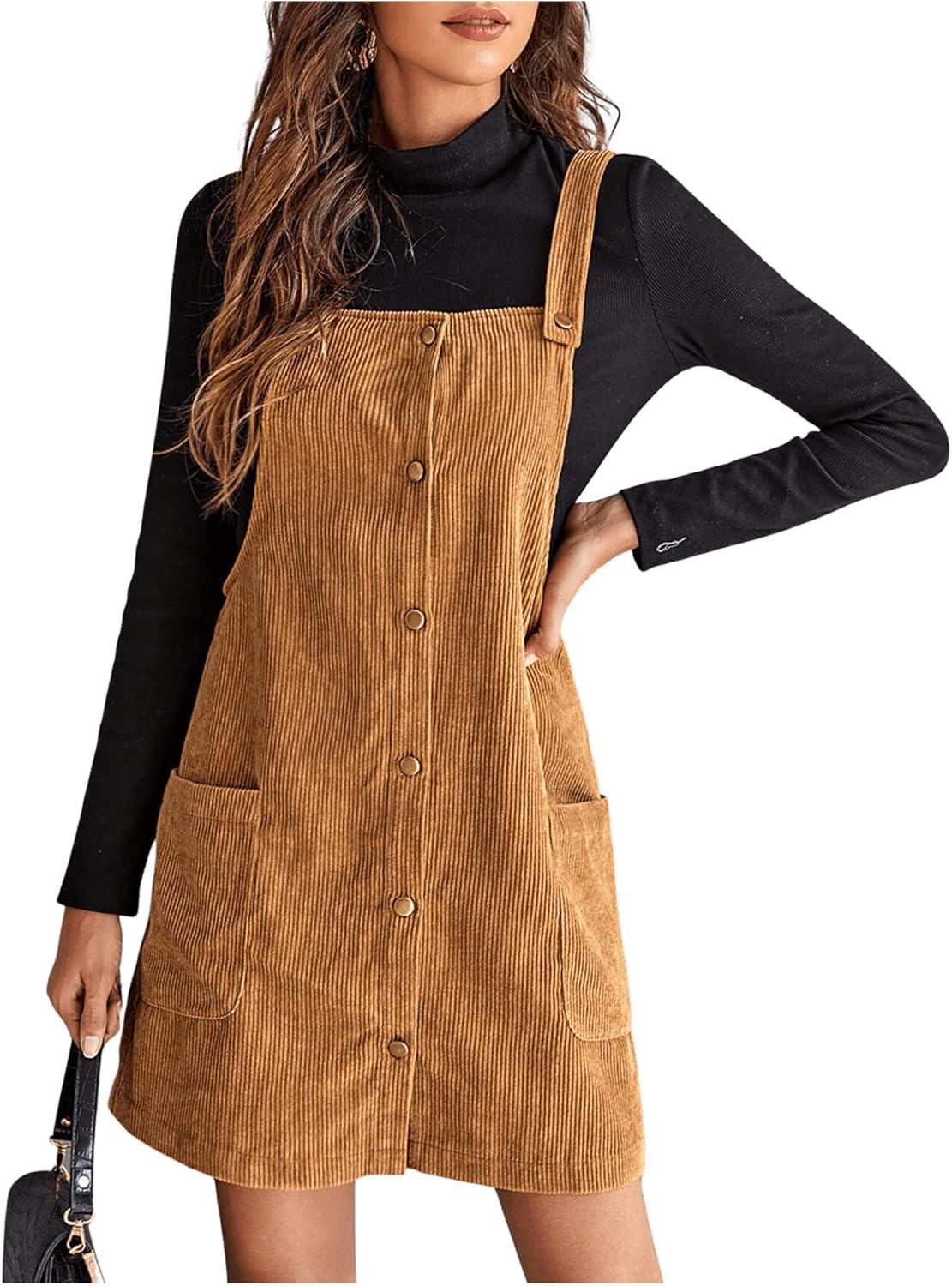 you pull on the Floerns women’s pinafore and the first thing you feel is the fabric settling — a medium-weight weave with a softly brushed face that gives structure without stiffness. As you stand and take a step, the skirt swings with a quiet,measured drape,the hem lifting and settling rather than clinging. The bodice keeps a clean line where the seams meet the bib, and the straps ease over your shoulders and stay put when you reach or sit, so the piece reads light above but carries a modest visual weight below.Up close the stitching sits flat and the material resists puckering, offering a familiar, lived-in calm more than a stiff, newness.
