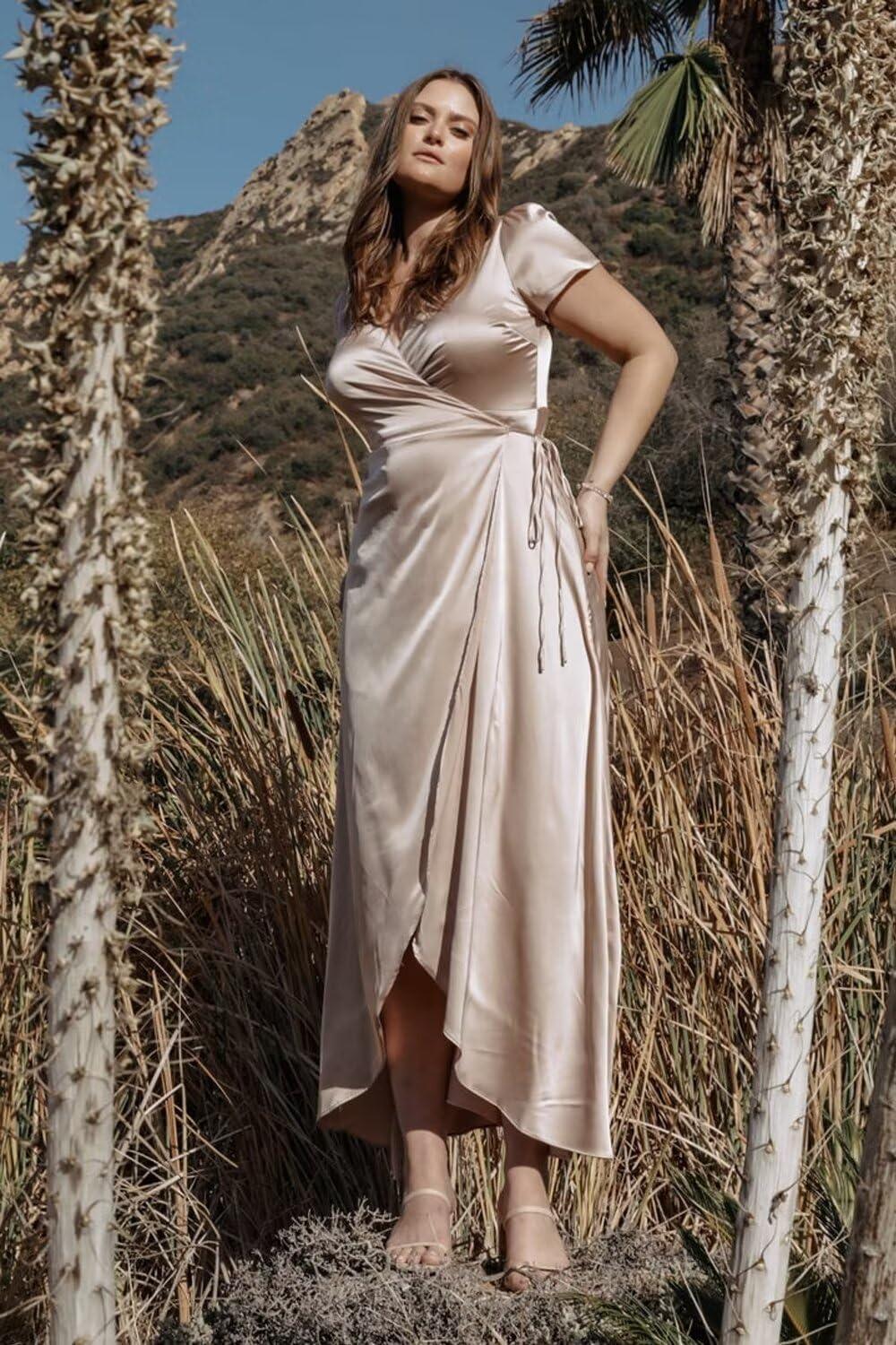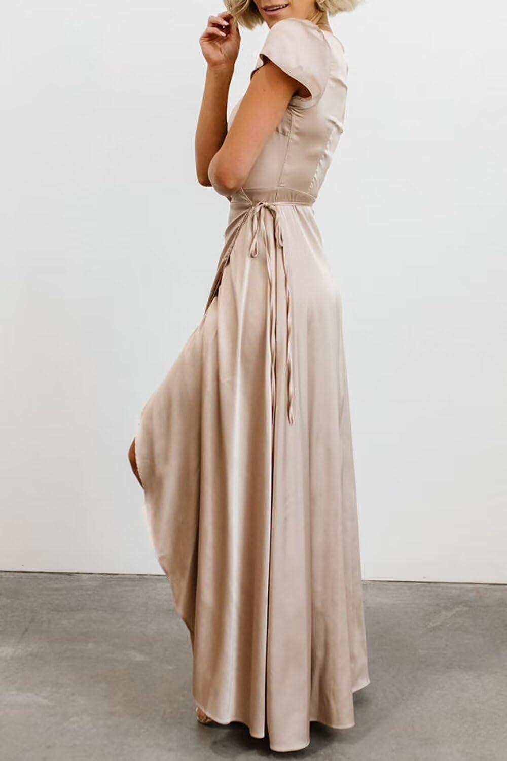 For those seeking a versatile gown that blends elegance with comfort, this satin wrap dress is an excellent choice. Its flattering V-neck design and pleated wrap detail enhance various body types, while the thigh-high split adds a subtle touch of allure, perfect for formal occasions or bridesmaid duties. The fabric’s smooth satin finish elevates the overall look, making it suitable for evening events, proms, and weddings alike. Additionally, the cap sleeve option provides a modest yet chic coverage, balancing style with grace.