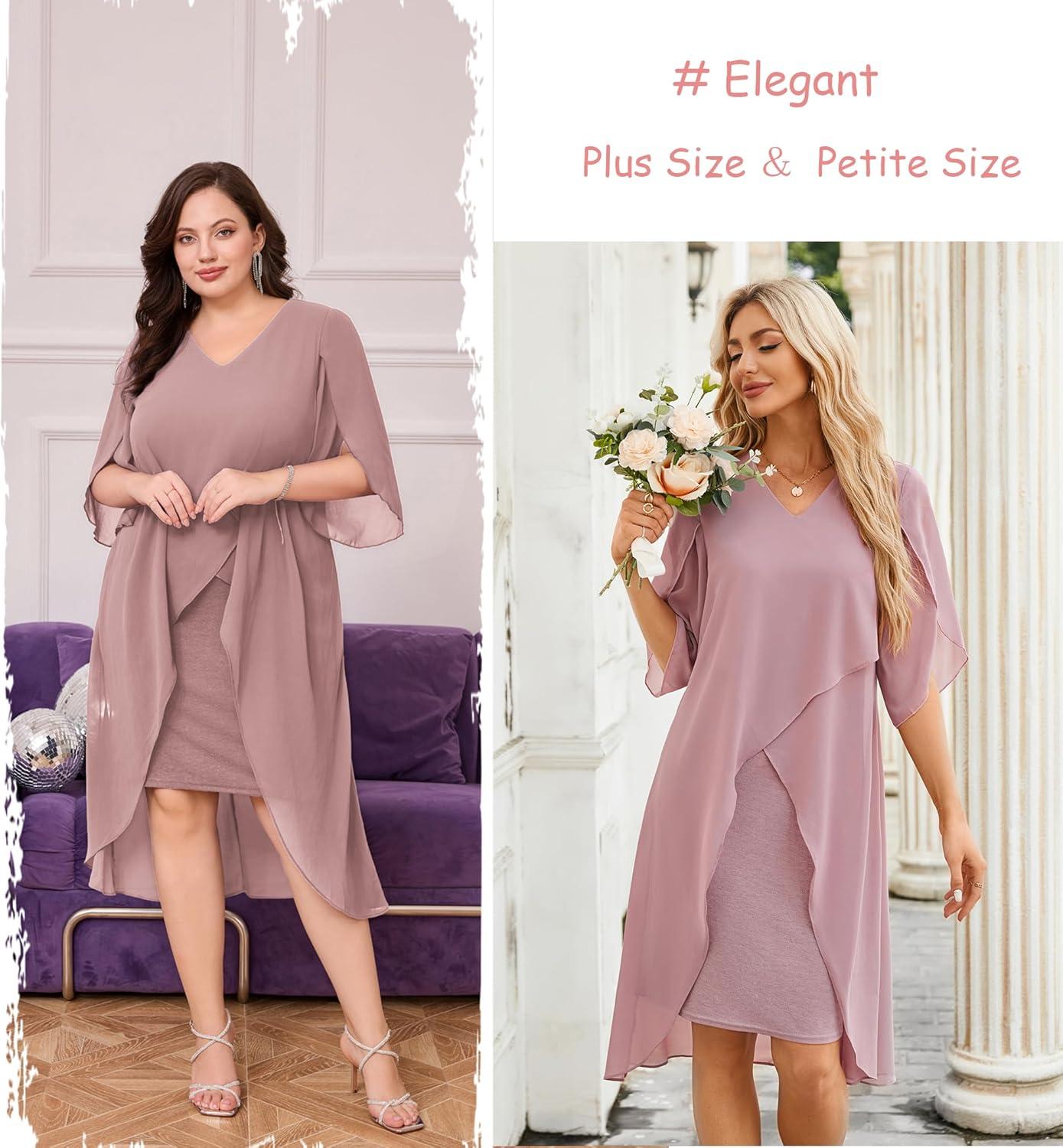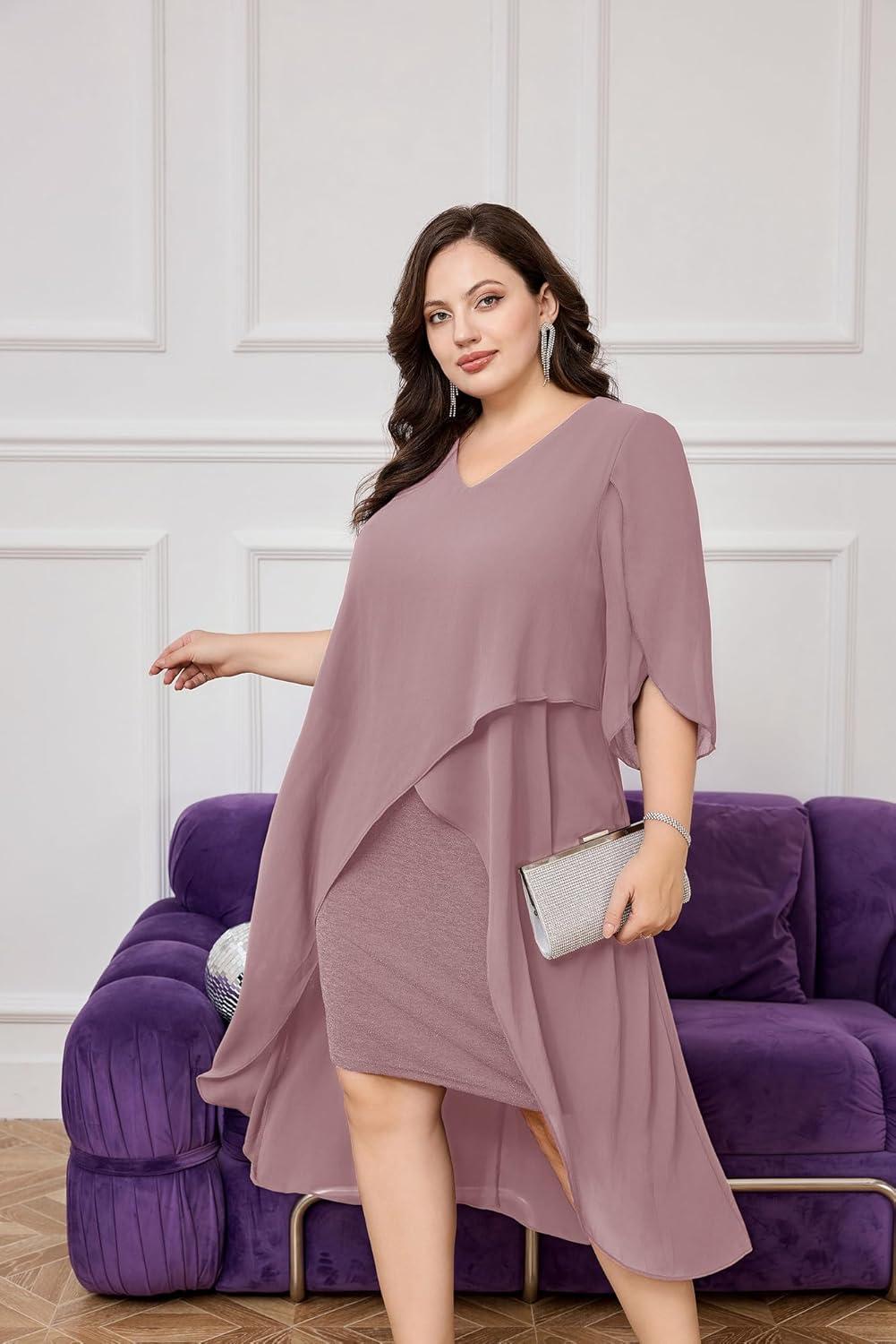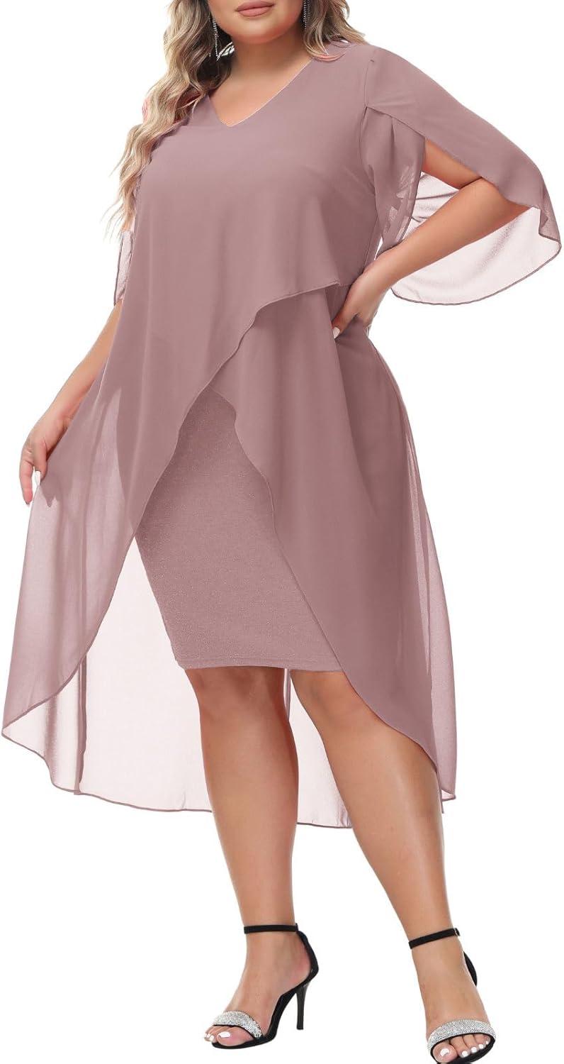 This chiffon cocktail dress beautifully combines elegance with comfort, making it an excellent choice for plus size women attending weddings, parties, or other special occasions. The soft chiffon overlay offers a flowy, slimming silhouette that gracefully hides imperfections while emphasizing natural curves. Its 3/4 ruffle sleeves add a delicate touch, balancing both coverage and style. The standout feature is the high low asymmetrical hem, which not onyl creates visual interest but also highlights the legs, lending a modern, chic vibe to the overall look.