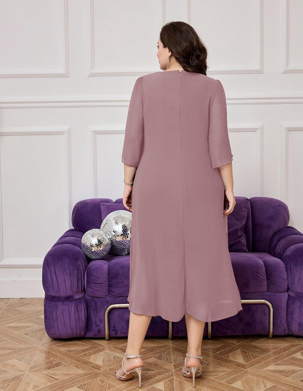 The moment we slipped into this dress, its soft chiffon overlay promptly made a difference in comfort. The lightweight fabric gently drapes over the body, creating a flowy silhouette that moves with us rather than restricting. Its 3/4 sleeves strike a perfect balance, offering coverage without feeling bulky or tight. The dress truly accommodates various body shapes, gracefully camouflaging imperfections while enhancing our natural curves, making it feel custom-tailored despite being a plus-size design.