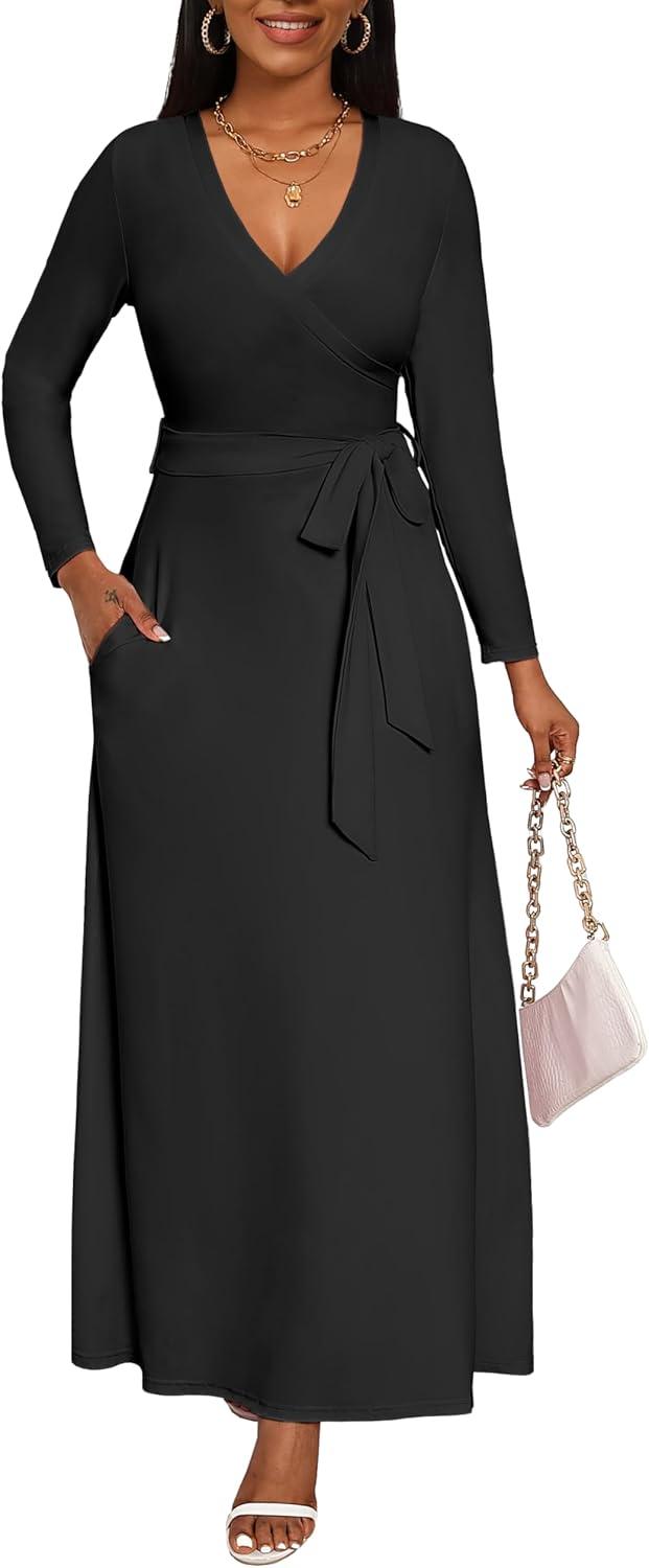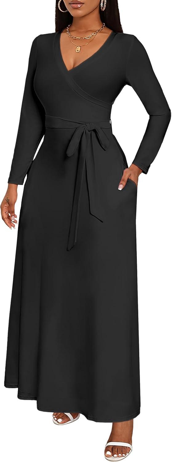 Complementing the neckline is the wrap tie waist feature, which is both functional and flattering. It allows us to customize the fit around the waist, accentuating curves in a subtle and sophisticated way. The self-tie belt easily cinches or loosens depending on our preference, making it adaptable for different occasions or changes in fit throughout the day. This design element also adds a dynamic layering effect to the maxi length, ensuring the dress flows gracefully without looking bulky.