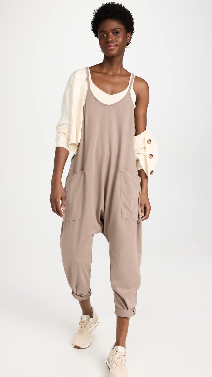 The first time you step into Free People’s Hot Shot onesie the fabric greets you with a quiet softness — plush against the skin but with enough heft to drape rather than cling. As you stand, the slouchy silhouette hangs in relaxed folds, the dropped crotch lowering the center of gravity so the legs fall with a gentle, roomy swing. Seams settle into your shoulders and along the sides with a lived-in softness, and the side pockets read as little bulges that shift when you move. When you sit the fabric pools around your thighs, smoothing into new lines, and when you walk it swings with a subdued rhythm that keeps the piece feeling weighty without being stiff. The first moments of wearing are less about structure and more about how the material responds — yielding, settling, and quietly shaping itself around whatever you’re doing.