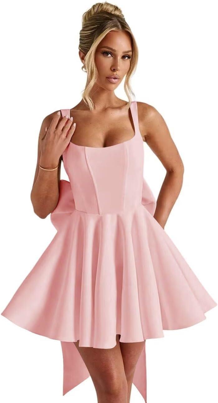 On arrival to an event, the piece reads promptly as a short, celebratory option: the square neckline and narrow straps frame the upper chest while the decorative bow becomes a focal point when standing still. In motion the skirt swings with each step and the satin surface catches light in short flashes, which makes the dress feel more animated than it does on the hanger. Over the course of an evening, the straps tend to require occasional nudging and the bow can migrate slightly from where it was first positioned, prompting brief smoothing at the waist or hips. Seated, the hemline often demands a modest shift to keep the front sitting as intended, a small, repetitive habit for many wearers.
