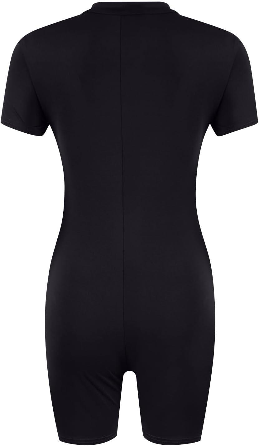 You see it listed as Generic’s Women Zip Up Bodysuits short Sleeve Jumpsuit, though in your hands it reads more like a zip-up, short-sleeve one-piece. As you slide into it the fabric greets you — a slightly cool, stretch-knit that drapes close to the body without feeling papery, with a soft matte face and just enough weight to skim rather than billow. Zipping up, the torso settles with a gentle, even compression across your midsection; the shoulder seams lie flat and the short sleeves hug without digging in.Standing, the piece moves with you — it follows a turn or a stretch and, when you sit, the knit gathers in small, lived-in folds at the hips rather than pulling taut.