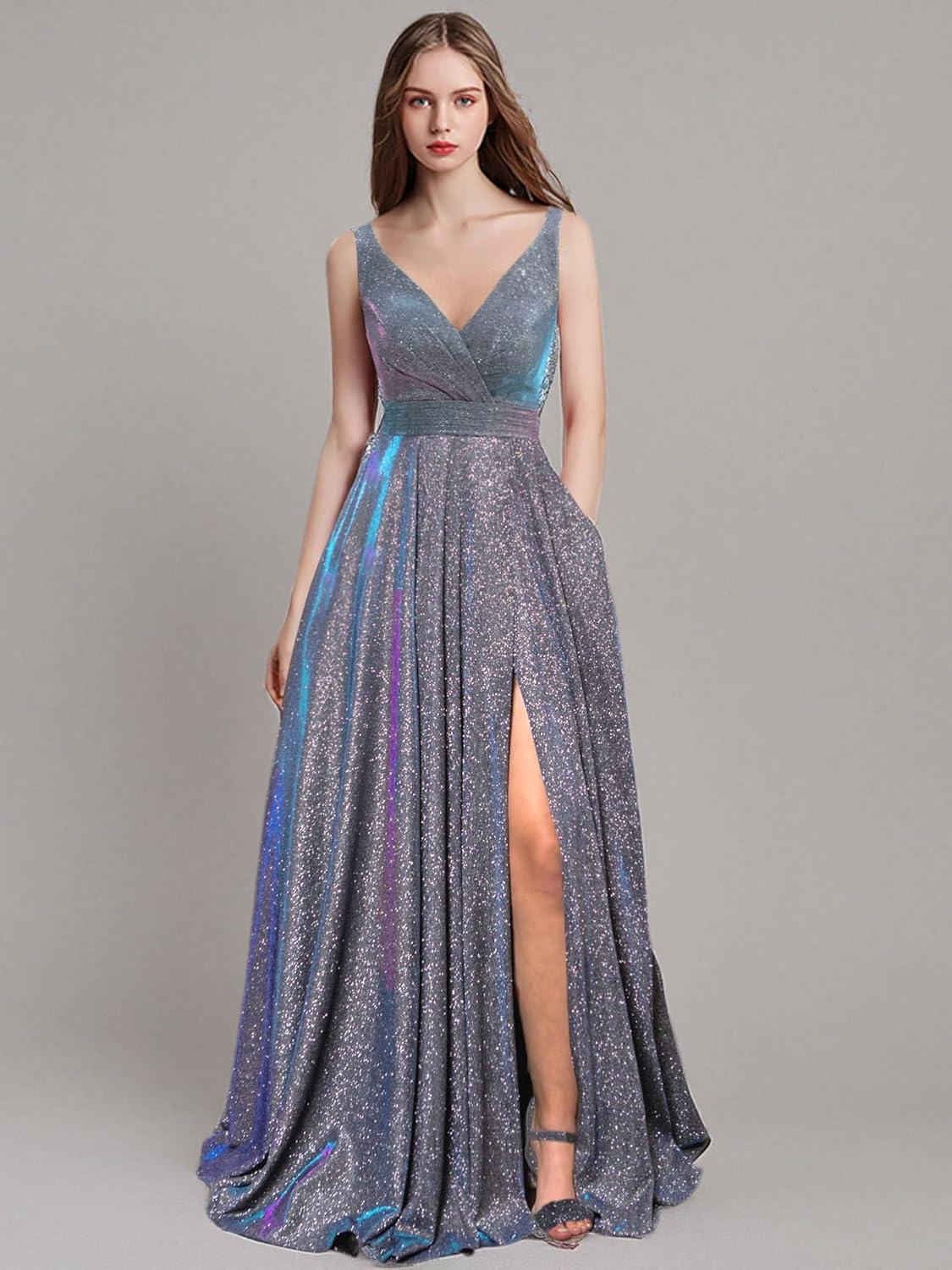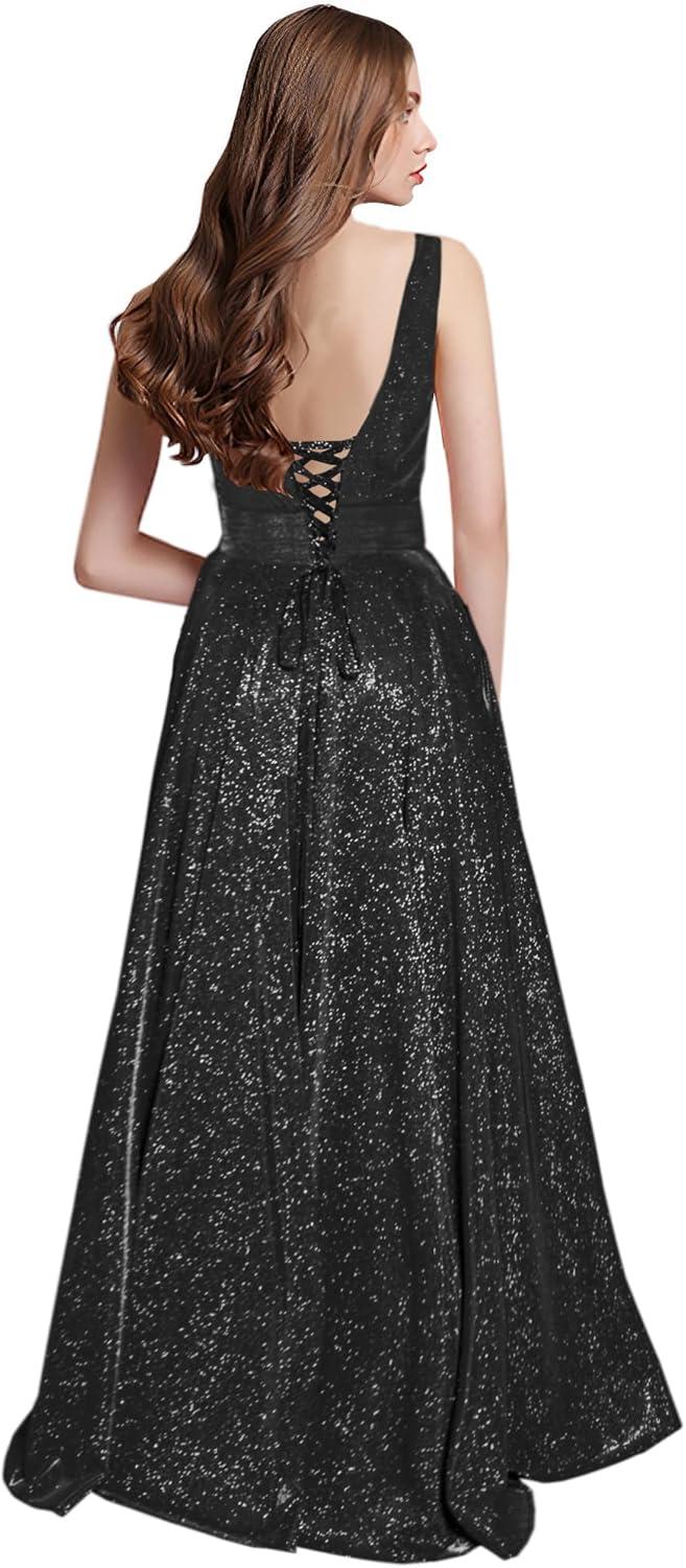We found this gown to be a splendid choice for any formal evening, combining elegance with practical design elements that truly stand out.The floor-length A-line silhouette flatters a variety of body types, gracefully elongating the figure while providing ample movement. One of our favorite features is the thoughtfully included pockets,which add a modern touch without sacrificing style-a rare find in formal dresses.the V-neckline and lace-up open back closure create a balanced blend of sophistication and allure, perfect for making a memorable entrance at prom, balls, or other special events. Crafted from glitter fabric, it catches light beautifully, ensuring you shine throughout the night.