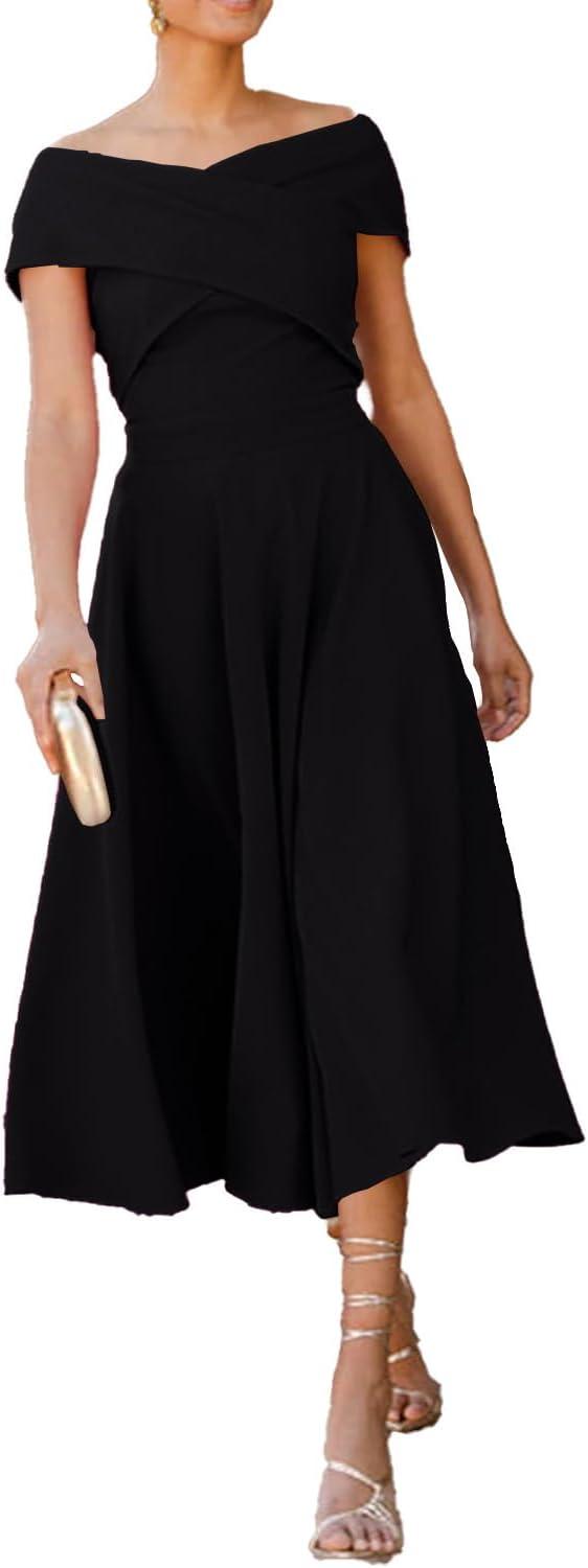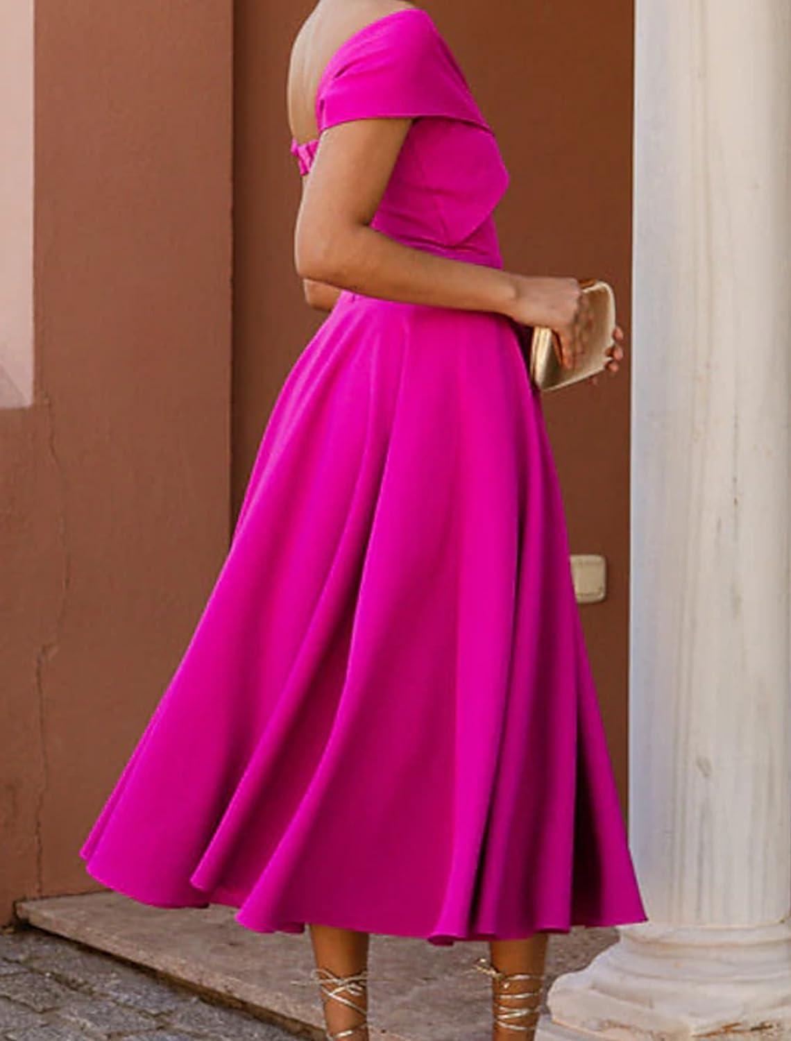 When imagined at a leisurely afternoon reception or a dimmer evening cocktail,the dress presents a composed silhouette that usually skims the lower calf and moves with a measured sway. Walking nudges the skirt into soft arcs; sitting flattens the skirt and occasionally calls for a gentle tug to settle folds. The off‑shoulder neckline reveals more back with certain gestures, so lifting the arms or reaching forward tends to prompt a quick readjustment of the bodice. Under steady light the overall outline stays orderly, while pockets of motion—crossing a dance floor, stepping down terraces—make that outline more animated than a static image suggests.