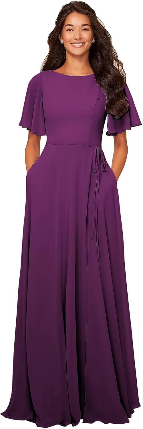You slip into the GOEBAODEEN Chiffon Modest bridesmaid Dress — an A-line, bateau-neck gown with flutter sleeves and pockets — and the chiffon is the first thing you notice. It feels light and slightly cool against your skin, with a matte, whispery surface that drapes more like water than fabric. As you move across the room the skirt ripples in soft waves,giving the dress a surprising visual weight at the hem while remaining airy higher up. The seams across the bodice lay flat and the flutter sleeves skim your upper arms rather than cling; when you sit the folds spread without bulk and the pockets sit quietly at your hips, noticeable only when your hands find them. Overall the initial impression is of gentle,purposeful movement and a fabric that settles into place rather than fights you.