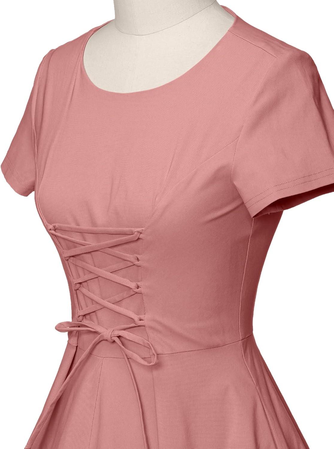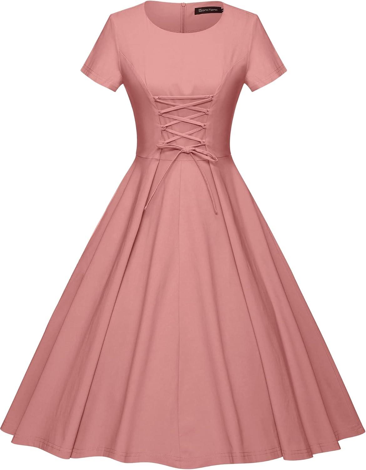 You slip into GownTown’s 1950s vintage swing dress and the first thing you notice is the fabric — a soft, slightly crisp weave that keeps its shape while still giving where it needs to. The skirt has a measured weight: it unfurls into a neat arc when you turn, but folds into gentle, layered ripples when you sit. The bodice settles smoothly across your chest, shoulder seams lining up without tugging, and the short sleeves move wiht your arms instead of binding. Up close the drape reads structured rather than stiff, enough body to skim contours without clinging. Standing still you feel the hem catch air; take a few steps and the swing becomes part of your motion, a quite, tactile detail you notice before anything else.
