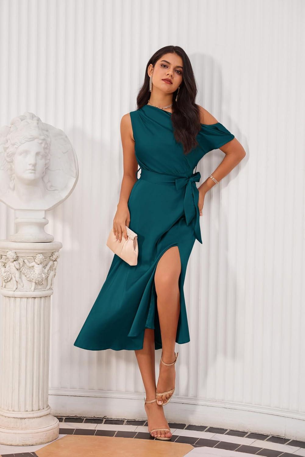 After thoroughly examining the design, material, and overall wearability, we find this elegant midi dress an excellent choice for cocktail parties, weddings, or any formal occasion where grace and comfort matter. Its fluid A-line silhouette paired with the one-shoulder satin fabric creates a balance of modern style and timeless femininity. The tie-waist detail helps accentuate the waist beautifully,offering a flattering fit without sacrificing comfort.The sleeveless design and soft, skin-friendly satin ensure breathability while maintaining an elegant shine, making it suitable for warmer weather events or indoor gatherings. Plus, the multiple color options allow you to personalize your look effortlessly.