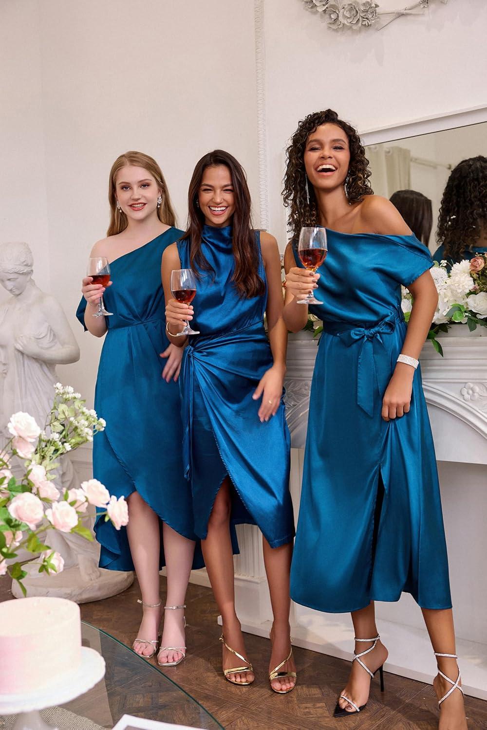to truly make this dress the centerpiece of your ensemble, consider pairing it with elegant accessories that enhance its sleek satin fabric and graceful silhouette. Opt for delicate jewelry such as thin gold or silver bracelets and subtle drop earrings to complement the asymmetrical neckline without overwhelming it. As the dress features a tie waist, balancing your look with a pair of classic pointed-toe heels or strappy sandals will elongate your legs and maintain the flowy, feminine vibe.For an extra touch of sophistication, a minimalist clutch in neutral or metallic tones adds refinement without detracting from the dress’s elegant simplicity.