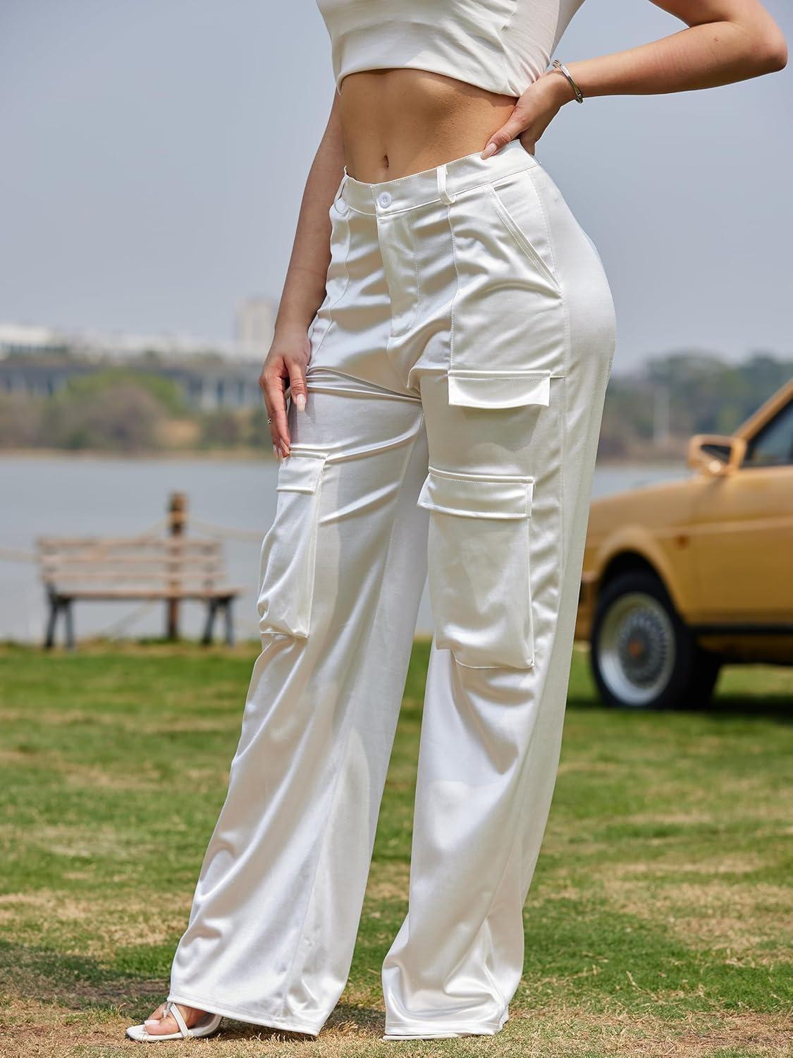 The frist thing you notice is how the satin glides against your skin—cool and a little dense, more substantial than a typical silky pant.With the High Waist Pants for Women Department’s satin cargo trousers (listed as “Womens High waisted Satin Cargo Pants”), the high waist sits up front and the wide legs unfold into a soft, measured drape as you take a step.Seams trace your hips without pinching, and the cargo pockets form small, lived-in shapes that shift when you sit. In daylight the fabric throws a muted sheen; in motion it swings with a gentle weight that feels steady rather than floaty. Little details—the waistband pressing when you lean forward, the hem brushing the top of your shoes—are what register first during an ordinary day.