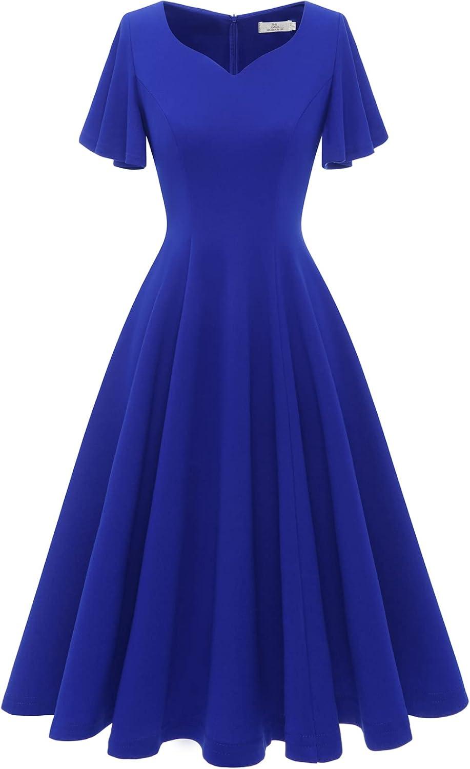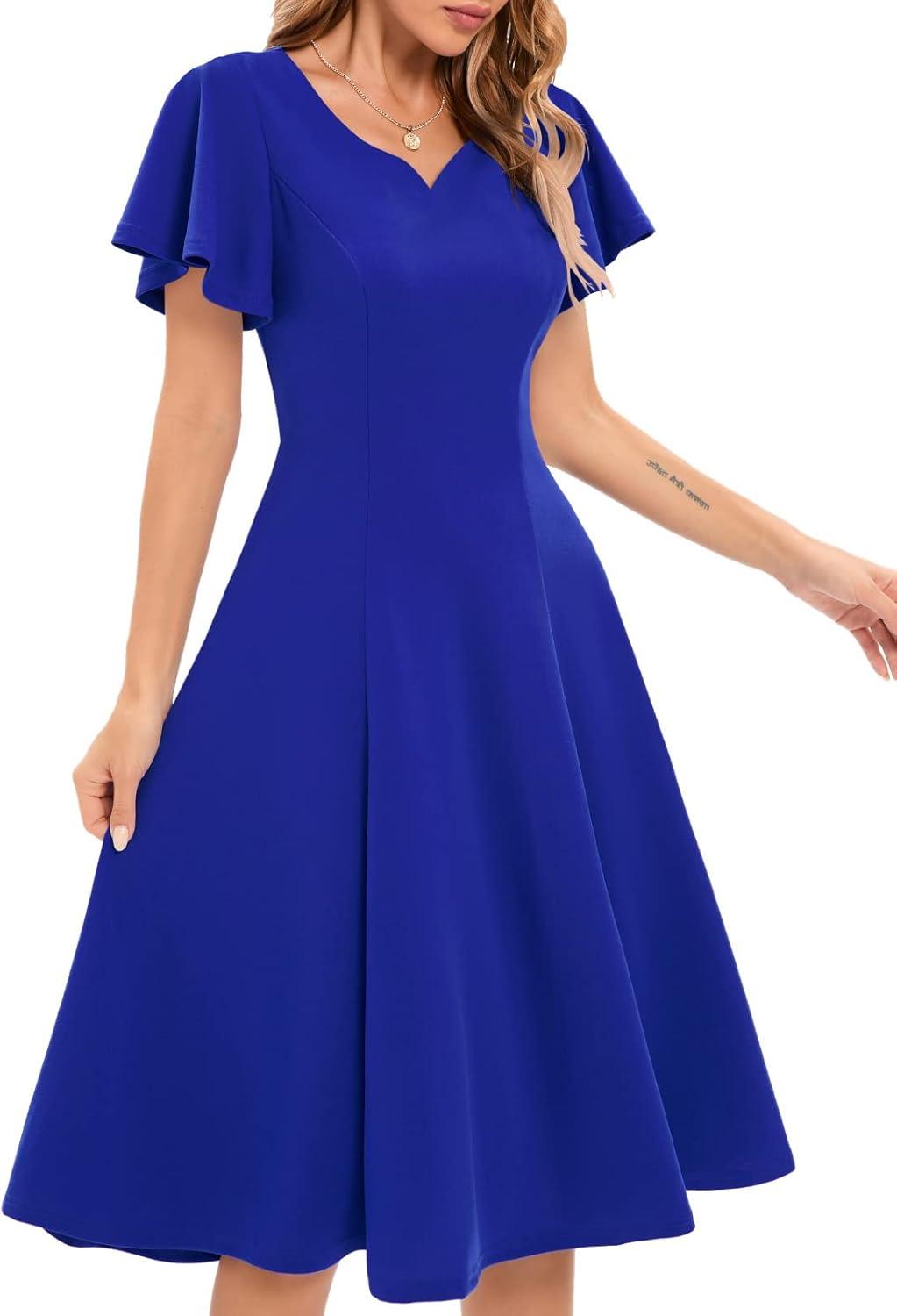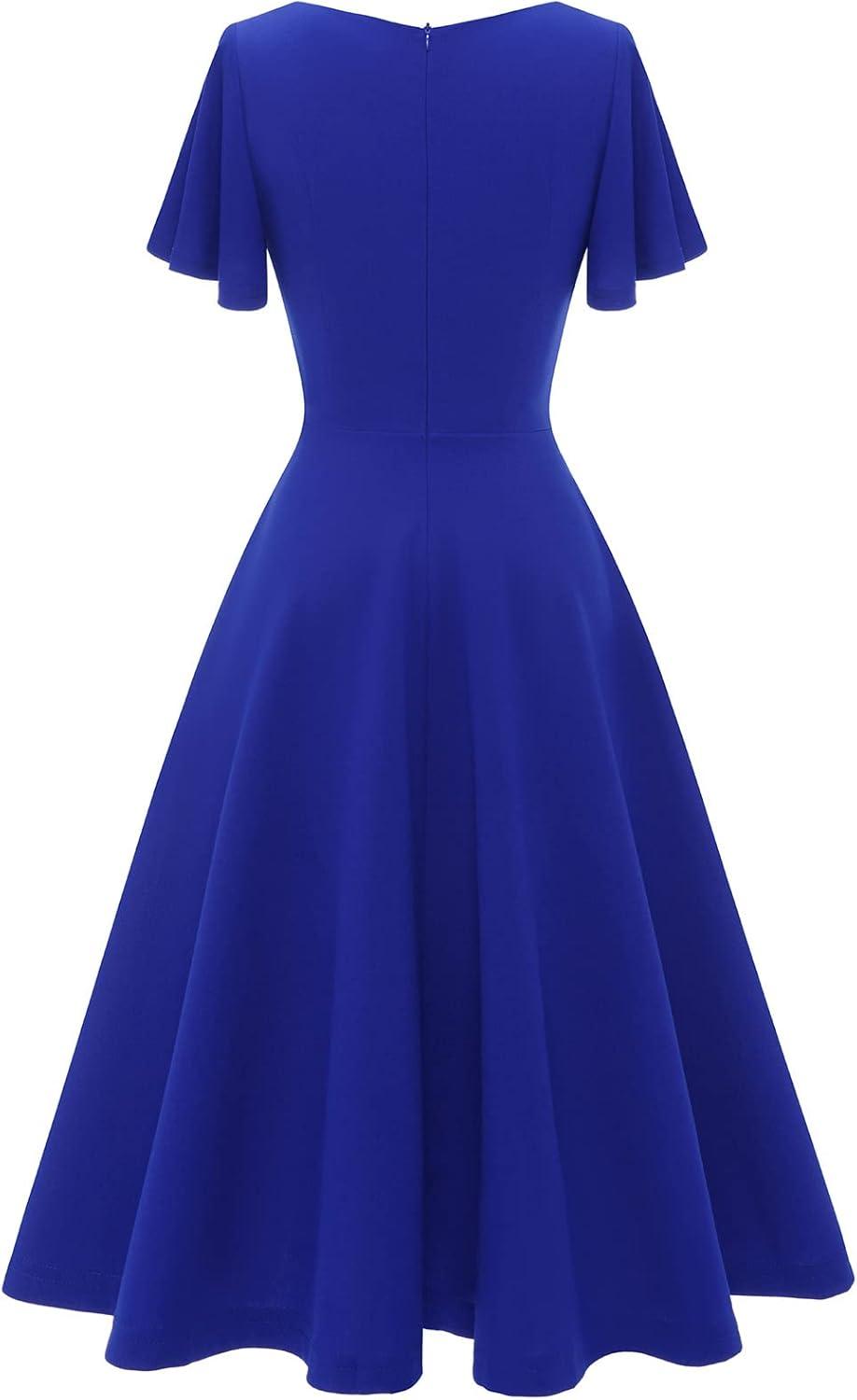 The first time you walk in it the skirt swings away from your hips in a measured, circular motion that feels composed rather than flimsy. It’s listed as the HomRain Wedding Guest Dress — a vintage short-sleeve, fit-and-flare cocktail piece — and as you ease your arms into the sleeves you notice a slightly crisp, tightly woven hand that still gives where needed. The waist seam sits flat, the bodice holds a gentle shape, and the hem carries a modest visual weight so the silhouette reads tidy when you stand. When you sit, neat folds form across the skirt instead of bunching, and in shifting light the fabric picks up a soft, low sheen that makes even small movements register.