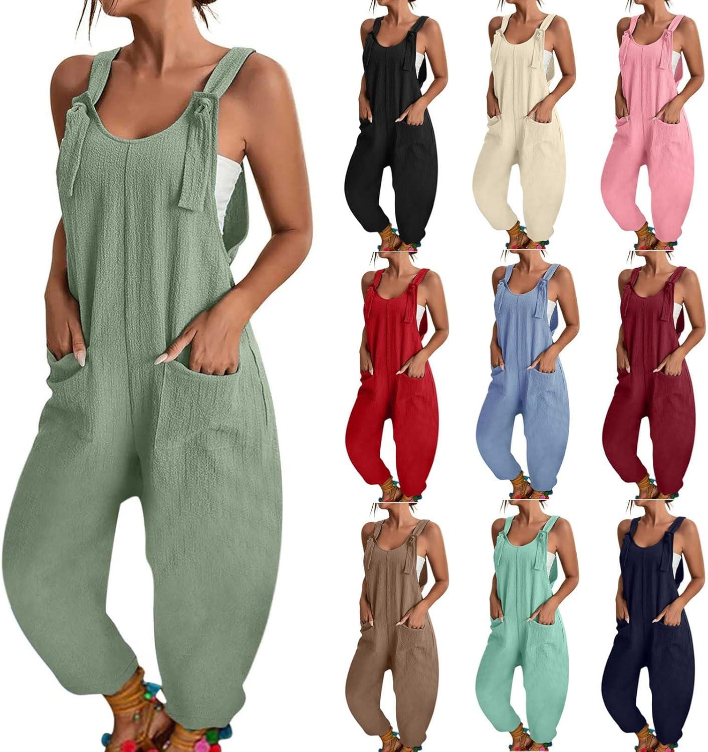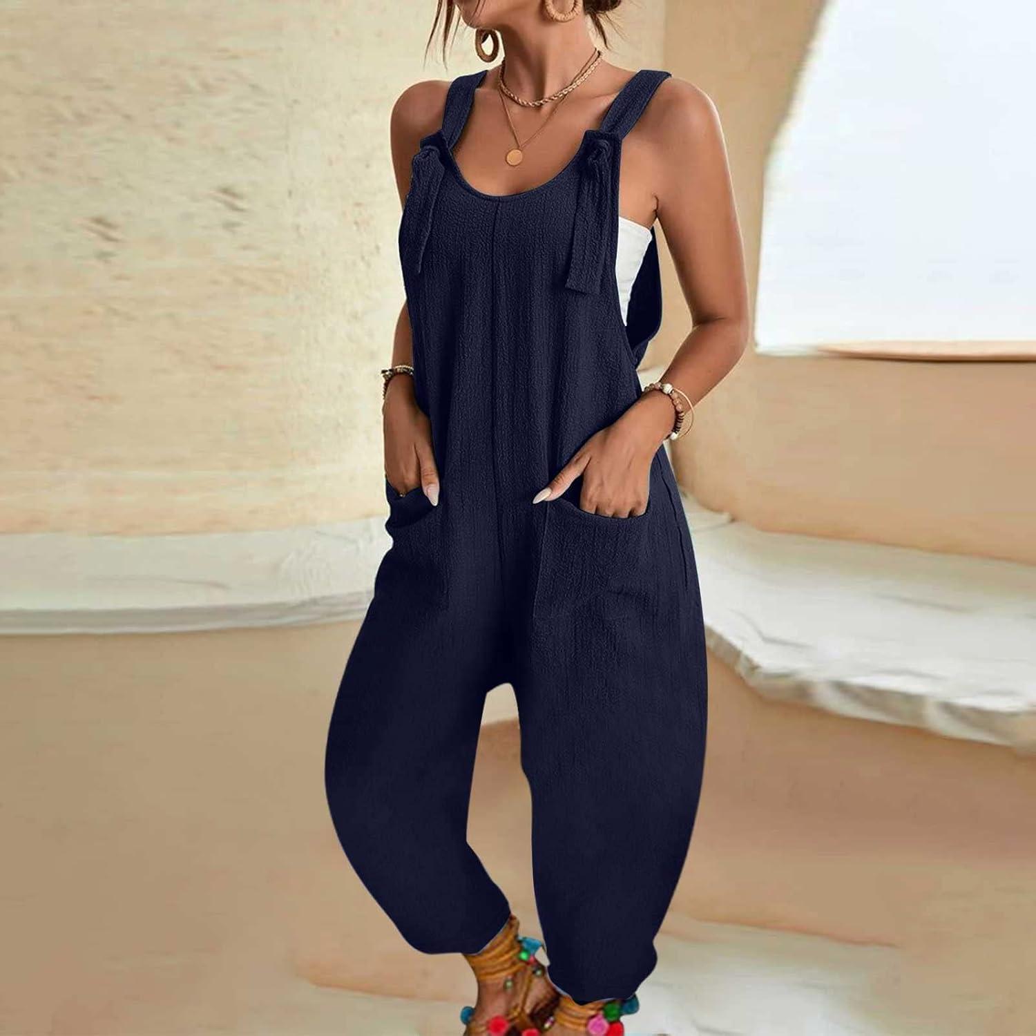 If you want something uncomplicated that leans more toward comfort than polish,this romper/Jumpsuit covers a lot of bases: a loose,long‑pant cut for ease of movement,sleeveless styling for warm days,adjustable tie straps to tweak the fit,and a pocket for small essentials. It makes sense for you if you prioritize breathability and low‑fuss dressing—think errands, travel days, backyard gatherings, or relaxed weekends when you want one piece that feels effortless.