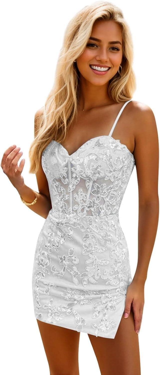 If you’re drawn to a short, sparkly dress that reads as playful rather than structured, this white sequin mini could work for you.It makes sense if you prefer lightweight, showy pieces for one-night events — think homecoming, a cocktail party, or an evening when you want a simple silhouette with a bit of shine. the V-neck and spaghetti straps keep the look minimal, so you’ll want to consider whether that level of exposure and the fitted cut match your comfort and the event’s dress code.